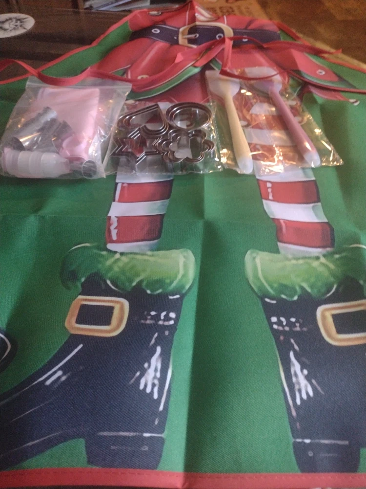 Get ready for some festive baking! I'm selling a Christmas-themed apron featuring an adorable elf design, complete with a baking set. The set includes piping tips, cookie cutters, and spatulas, perfect for creating holiday treats with the family. A fun and practical addition to your kitchen this Christmas season. Comes in Christmas Box