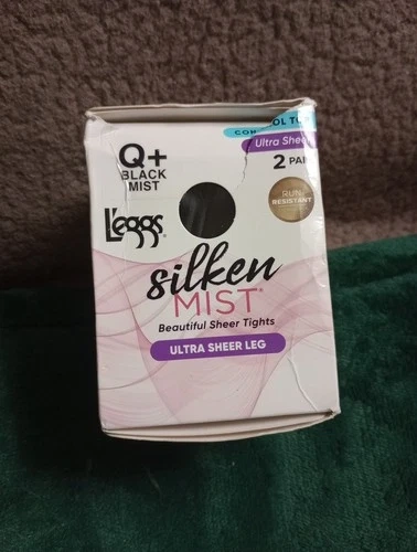 Pair of L'eggs Silken Mist Silky Ultra Sheer Leg Tights in Black Mist color. These 20 denier tights feature a solid pattern, control top design, and sheer toe style. Made of nylon and elastane, they are designed for all seasons and are available in a plus size. The tights offer a luxurious and elegant look, perfect for adding a touch of sophistication to any outfit.