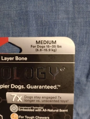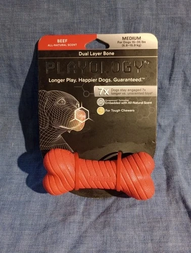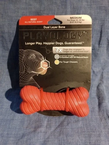 This Playology Dual Layer Bone Dog Toy is a durable playtime essential for medium-sized dogs weighing between 15-35 lbs. It features an all-natural beef scent and is sure to keep your furry friend entertained for hours. The unique design and beef scent make it a delicious and exciting addition to your dog's toy collection, providing plenty of opportunities for playtime and fun. It really appears to be a high-quality dog toy like most Playology items. Please take a peek at the pics to see if you agree.