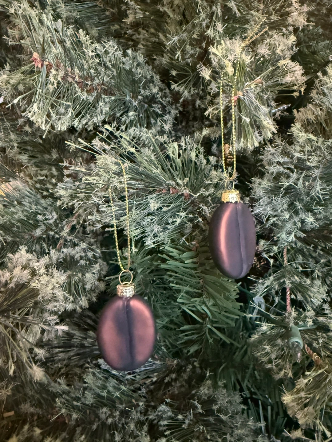 Two small glass coffee bean ornaments ornamental originally purchased from Goodge Place in South Granville (Vancouver).