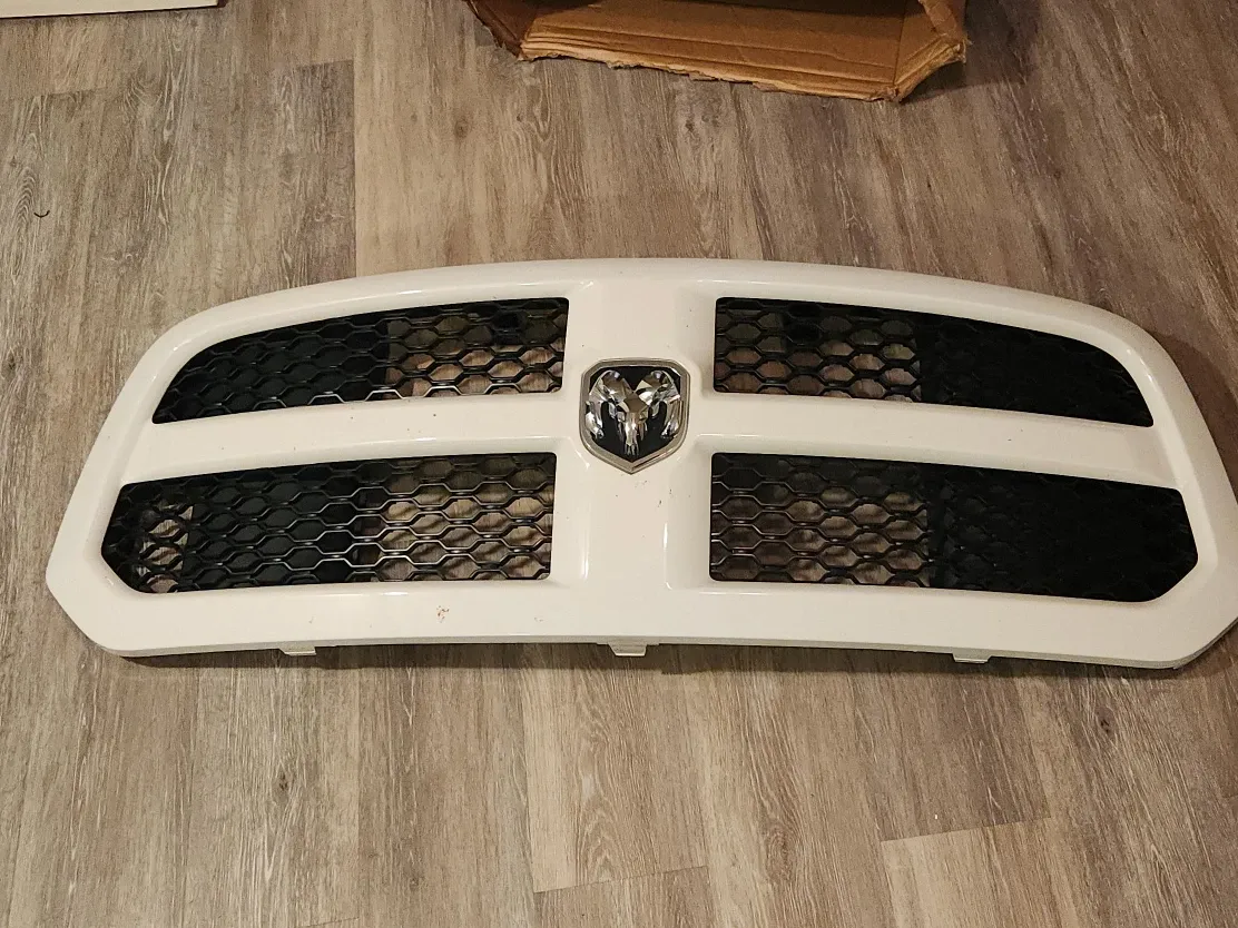 Selling a white grill for a Dodge Ram. It features a honeycomb pattern behind the bars and the Dodge logo in the center. It's in good condition and ready to install!