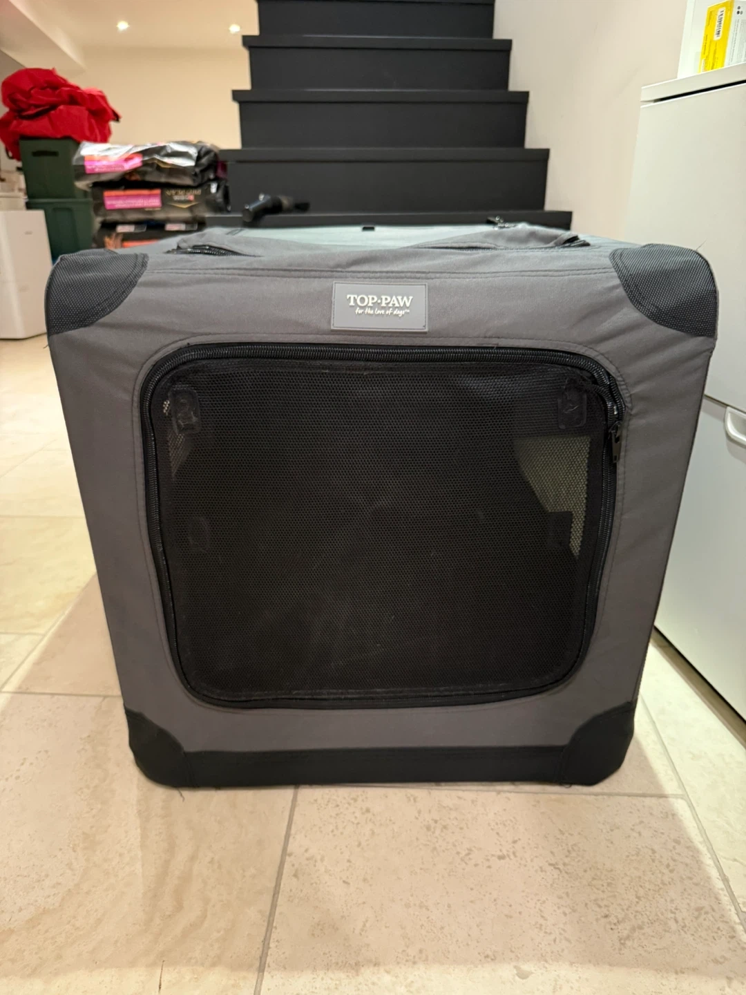 Selling a TOP-PAW 36" canvas crate for dogs. It's in great shape and comes with the original box! The crate is portable and folds away easily for storage and travel. It's designed for dogs up to 70 lbs (31.7 kg). Dimensions are 36 L x 24 W x 24 H (91.4 x 60.9 x 60.9 cm).