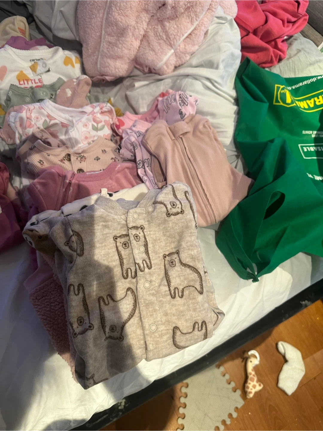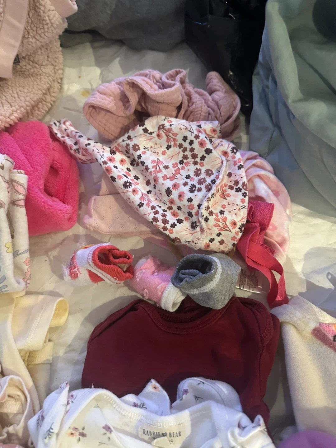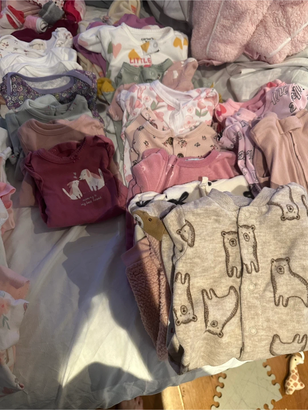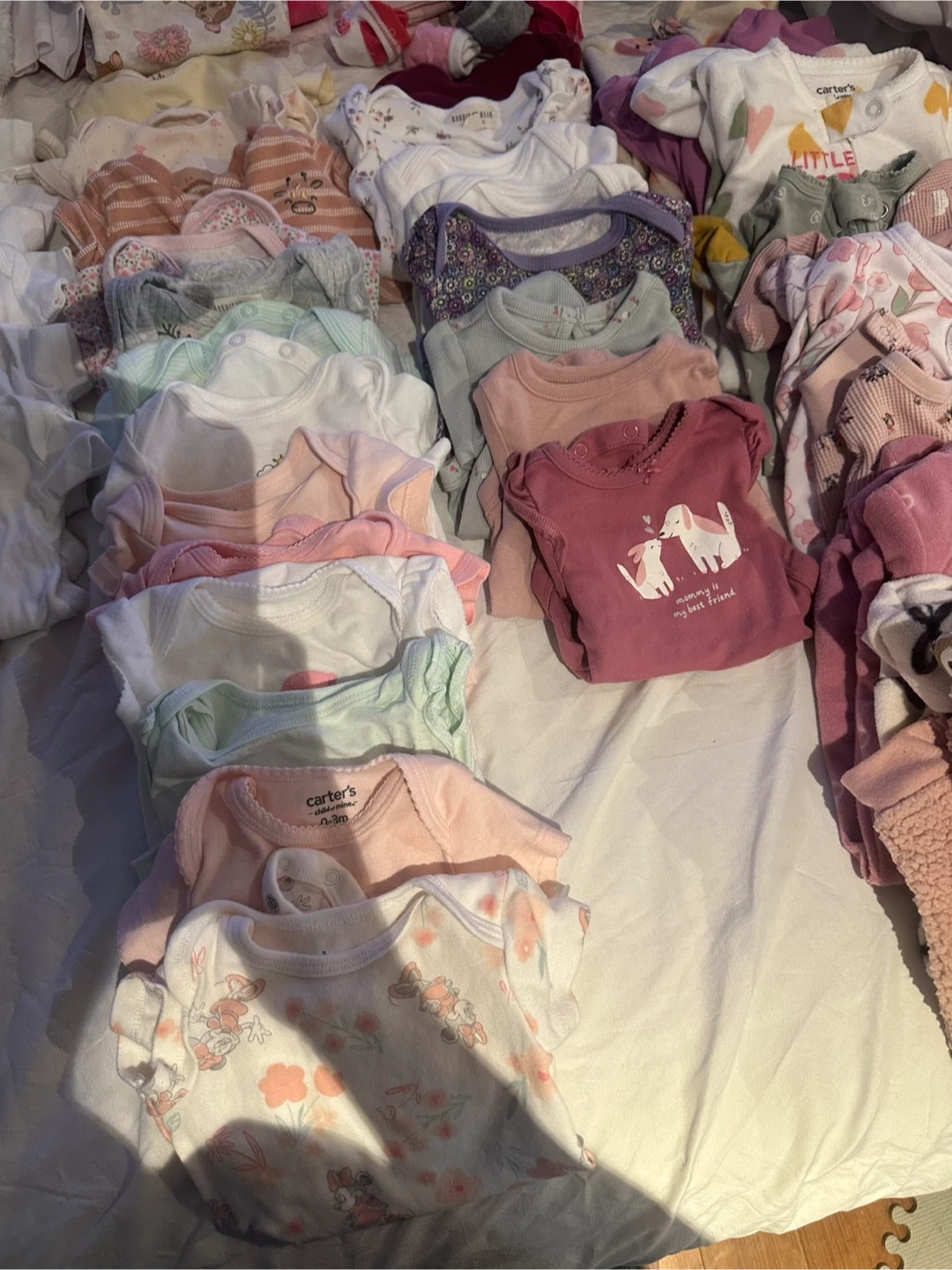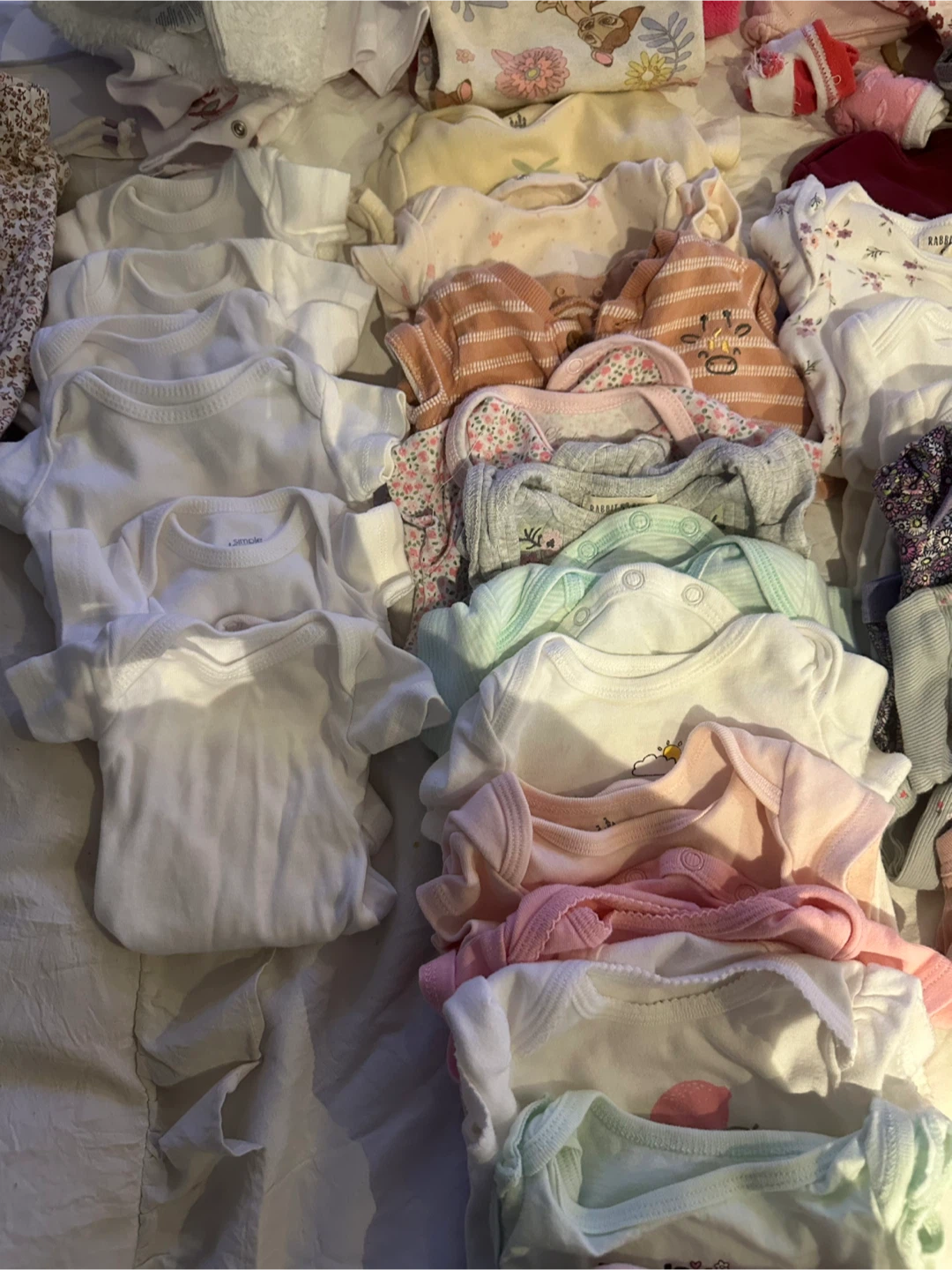 Selling a big bundle of baby clothes, mostly size 0-3 months! There are a variety of items, including onesies and pants. Brands include Carters and others. Perfect for a new baby!