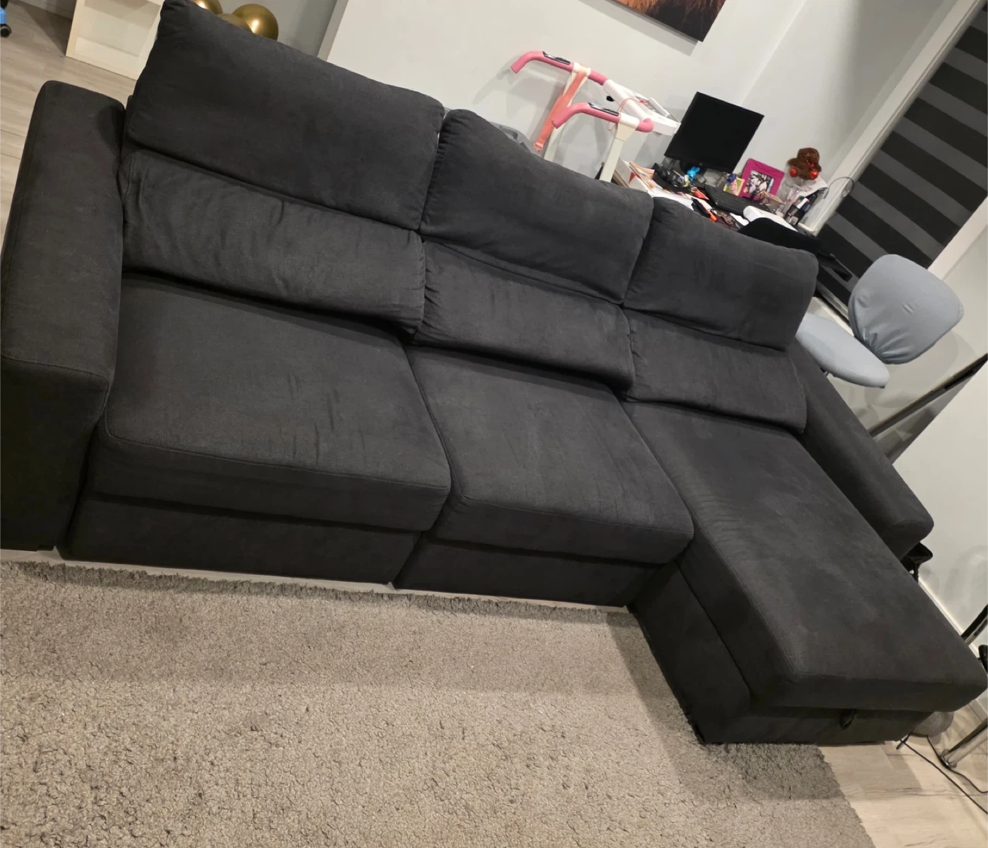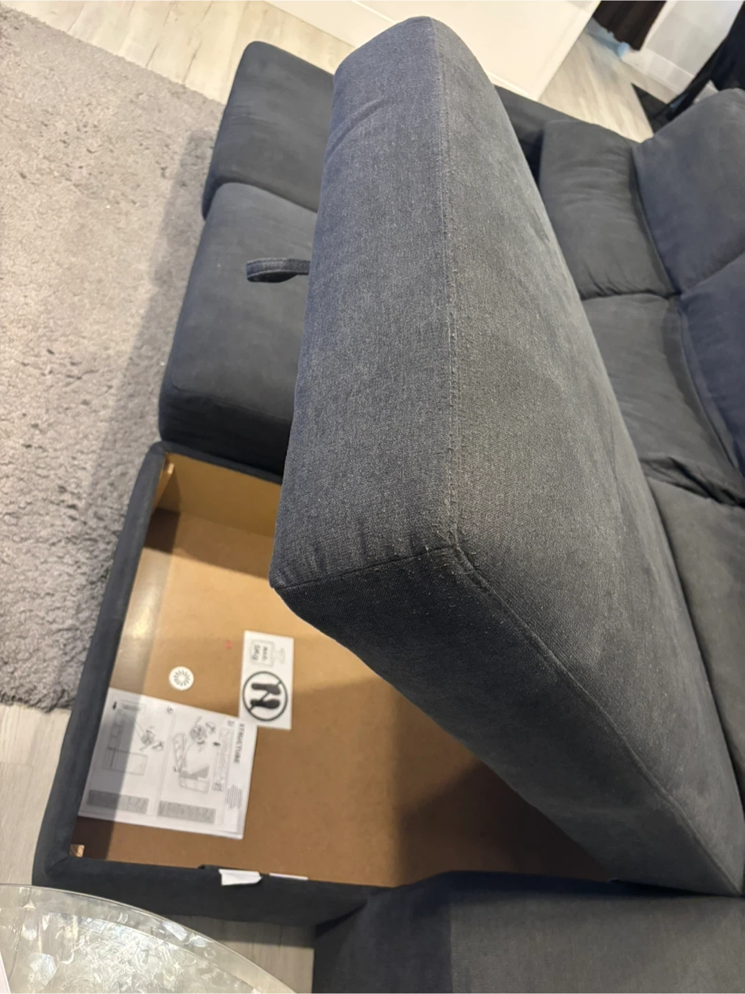 Selling a comfy grey sectional sofa! It's in great shape and features convenient storage. Perfect for relaxing and keeping your living space tidy.