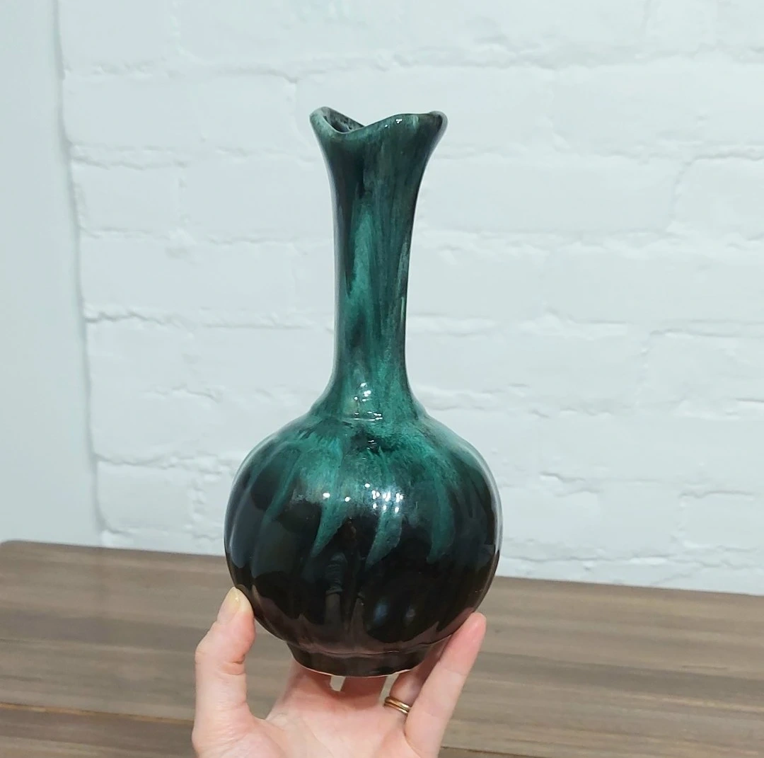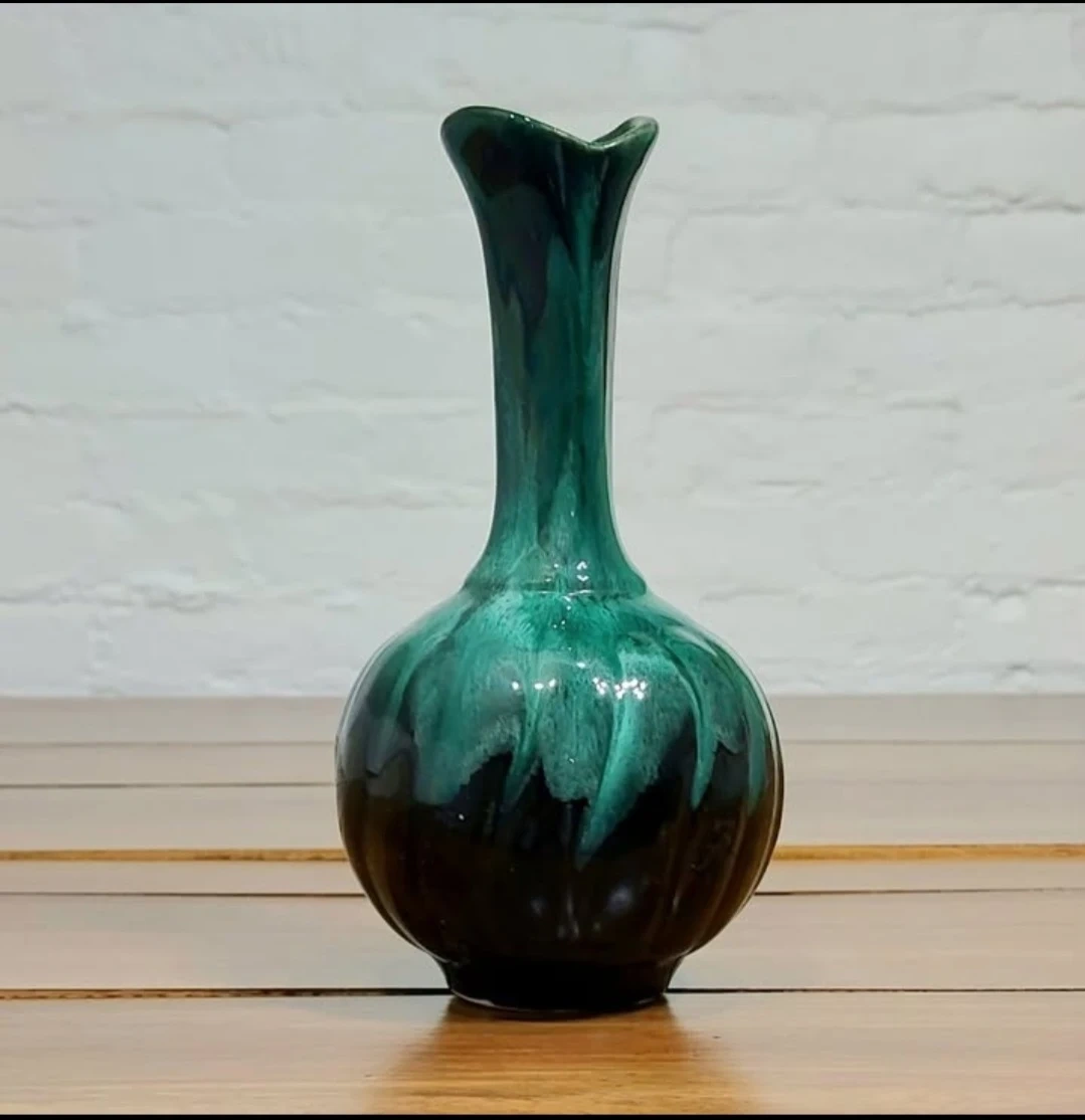 Features a rich and striking aqua blue color on upper portion of the vase, with a contrasting rich black color.