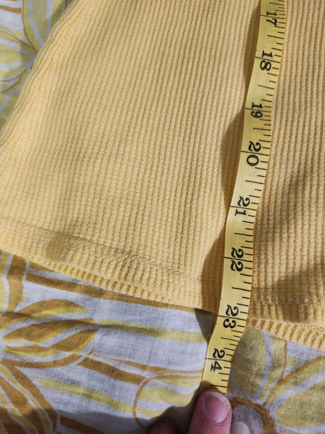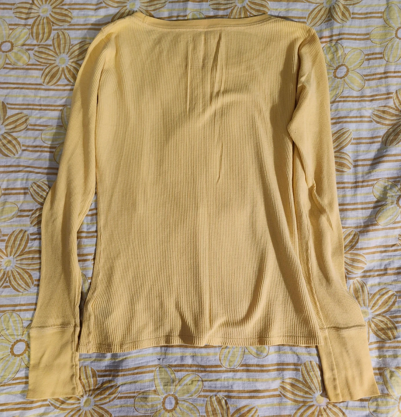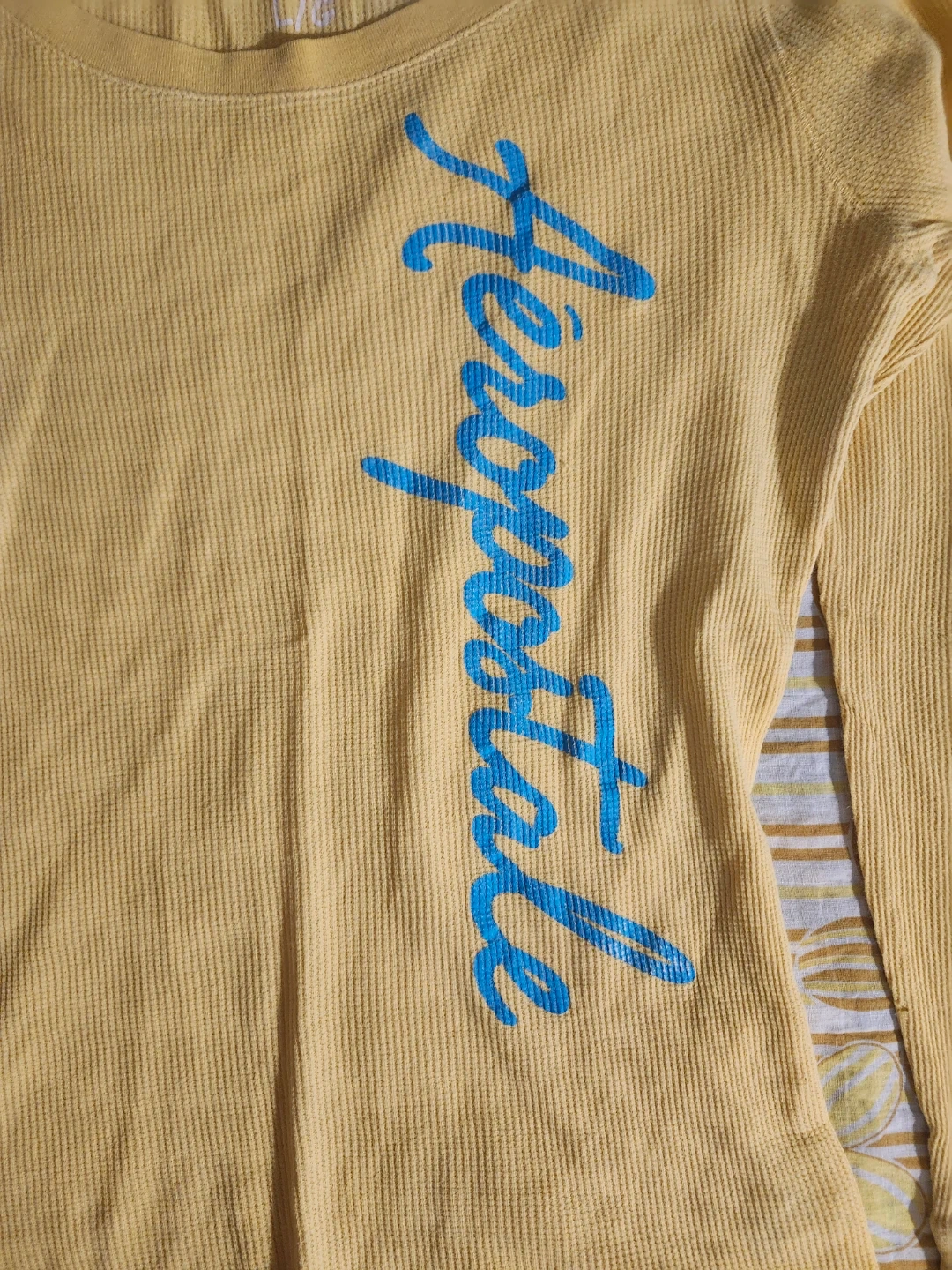 cute yellow and blue Aeropostale waffle texture long sleeve shirt. fully printed design and a cozy texture!