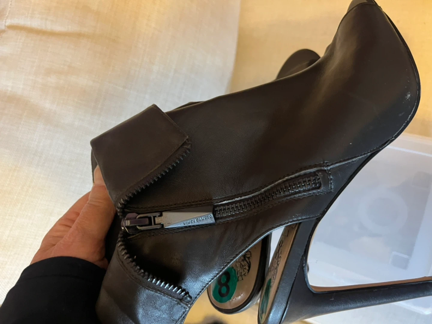 A pair of Vince Camuto greyish black leather heels in a size 8. They feature a stylish design with a zipper detail. Perfect for adding a touch of elegance to any outfit! Brand new. Pet and smoke free home. Pick up in Stittsville.