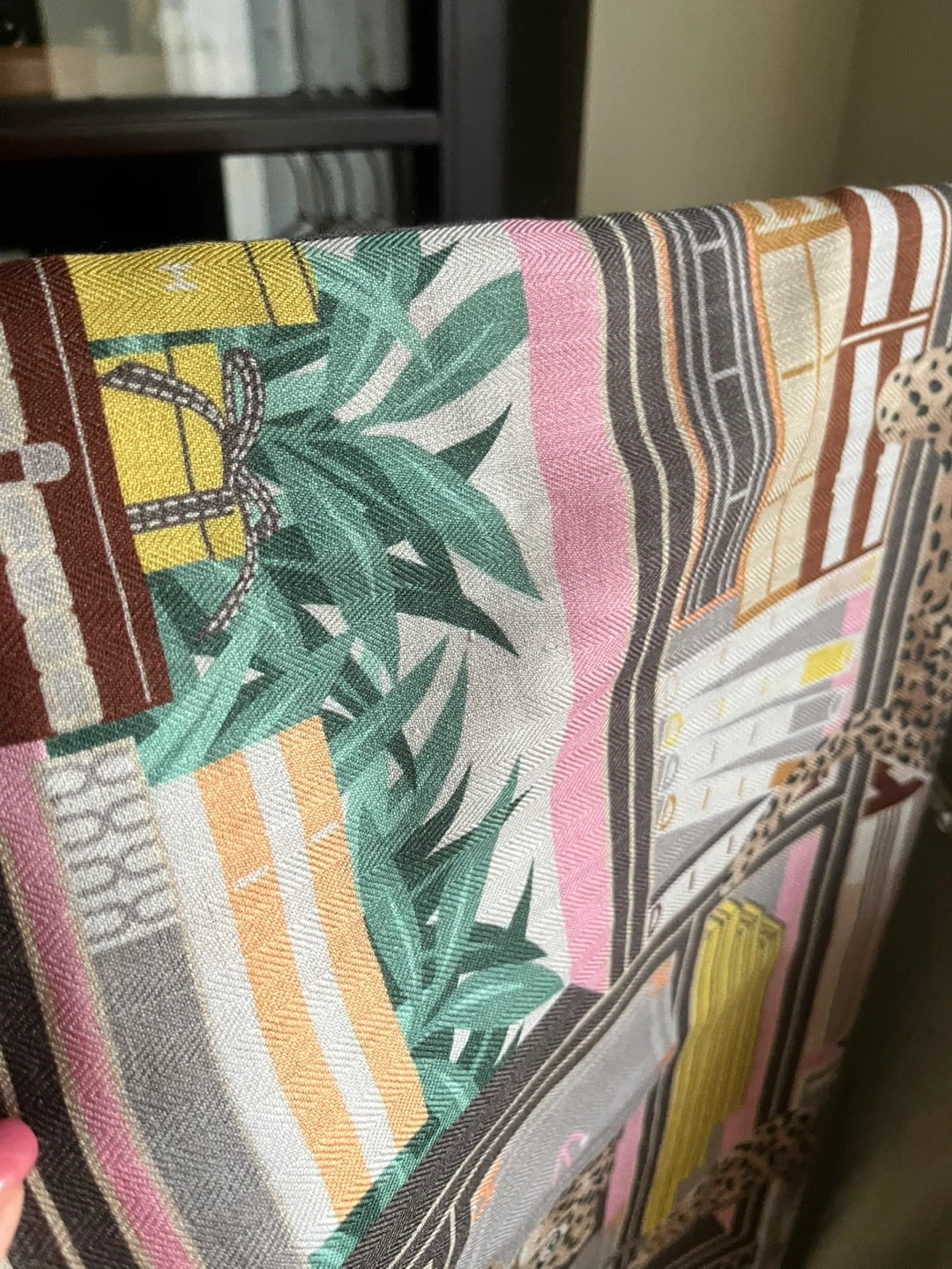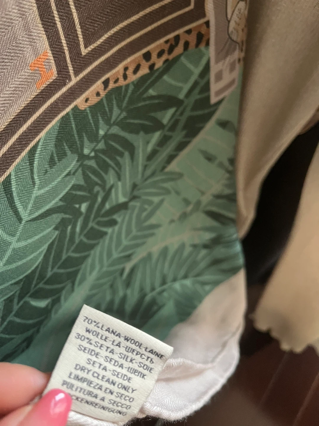 Stylish scarf made from a blend of 70% wool and 30% silk! The design features a mix of geometric patterns and botanical elements, adding a touch of elegance to any outfit