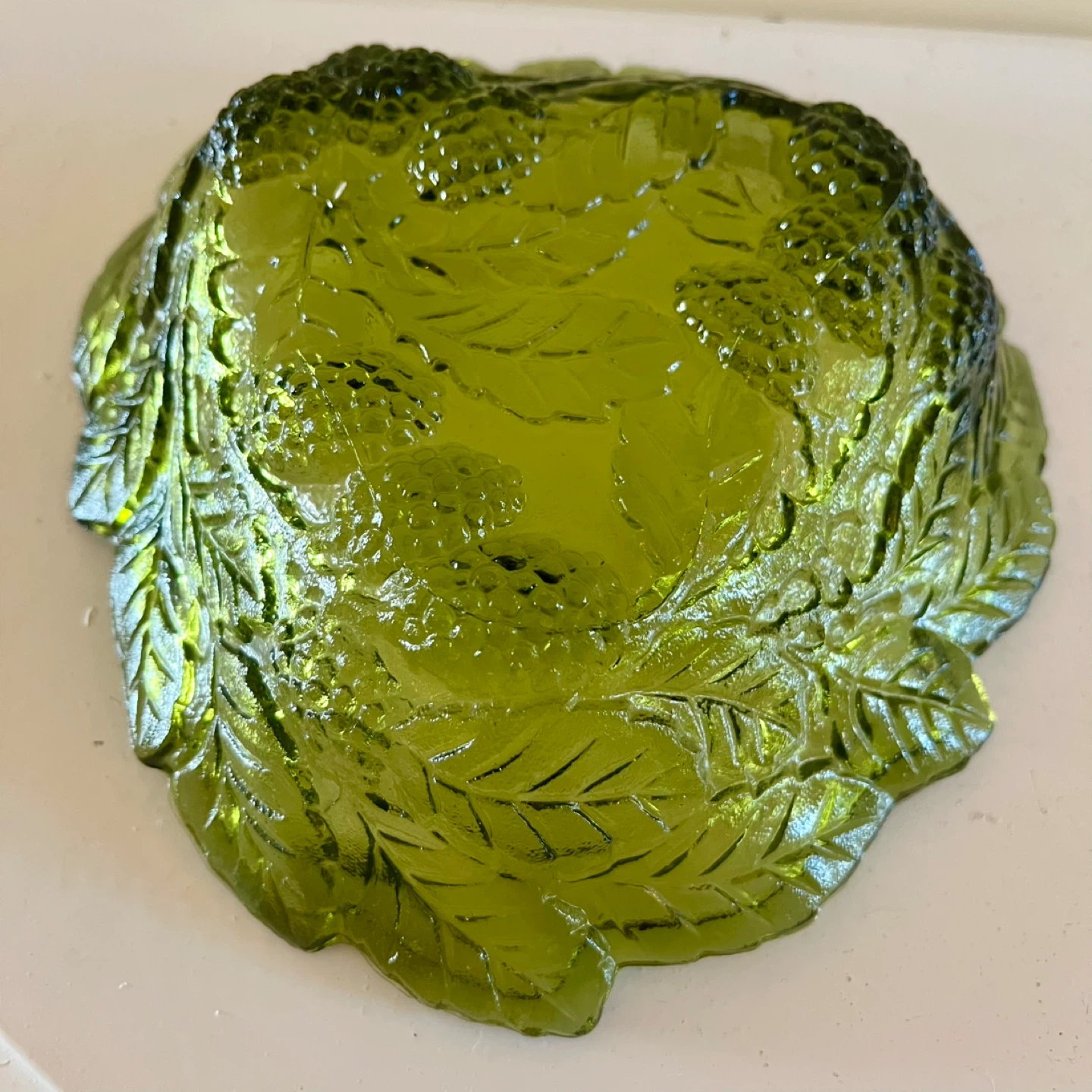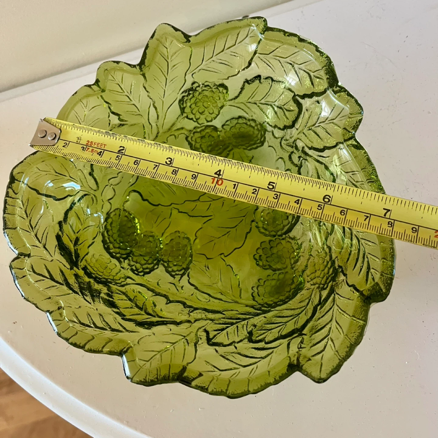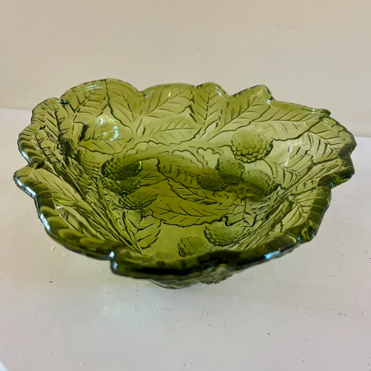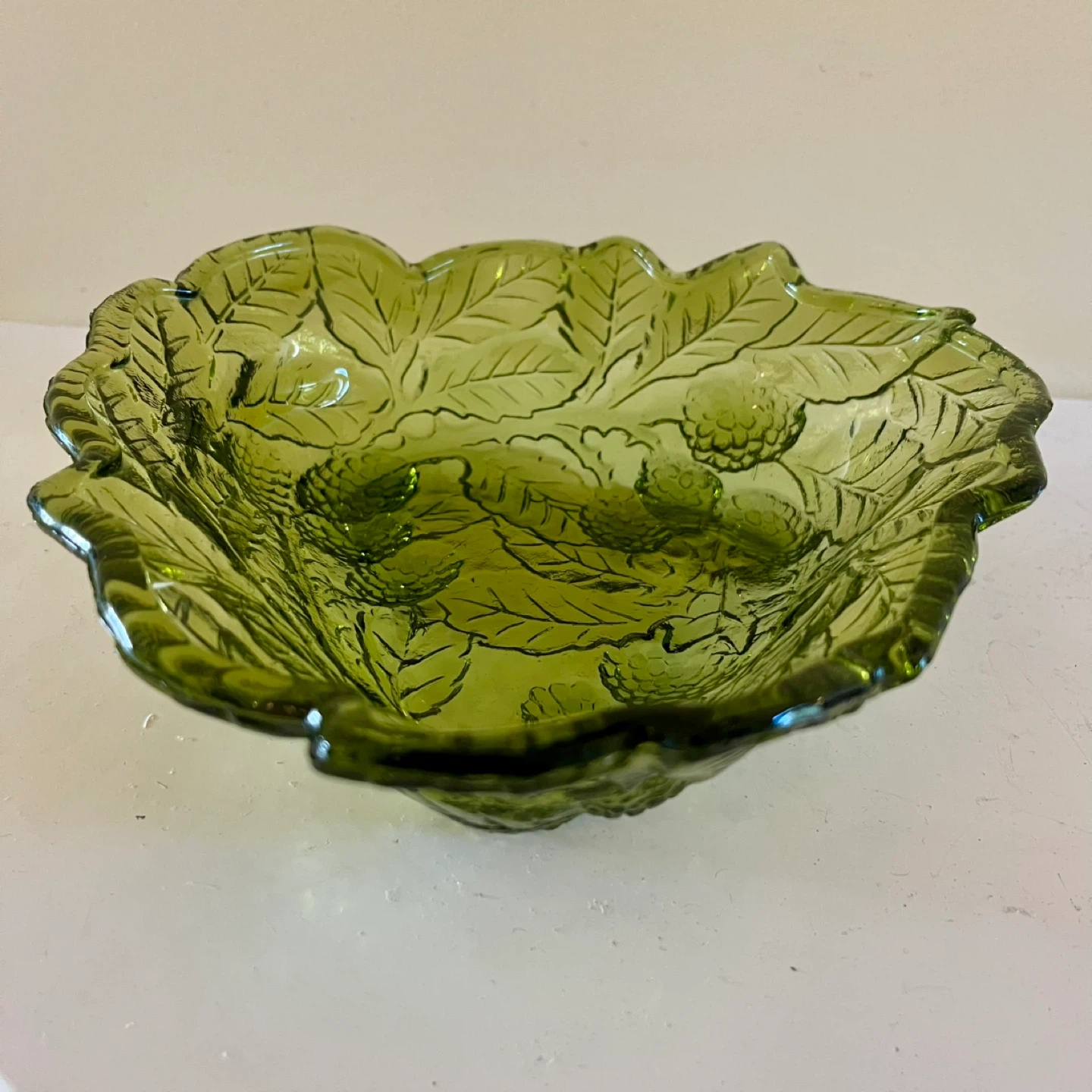 This lovely vintage green Indiana glass bowl features a raised leaf and loganberry pattern, adding a touch of vintage charm to any space.
