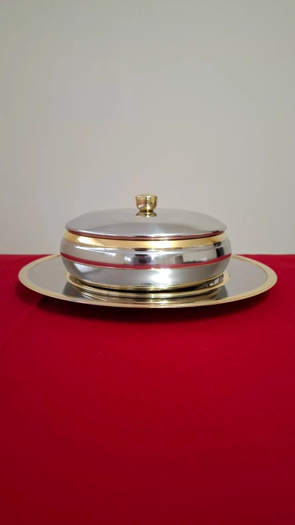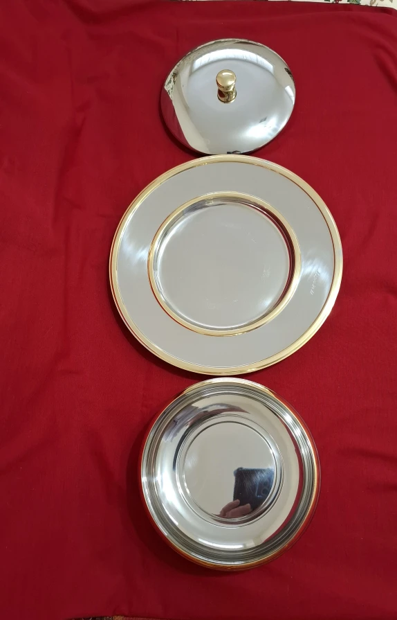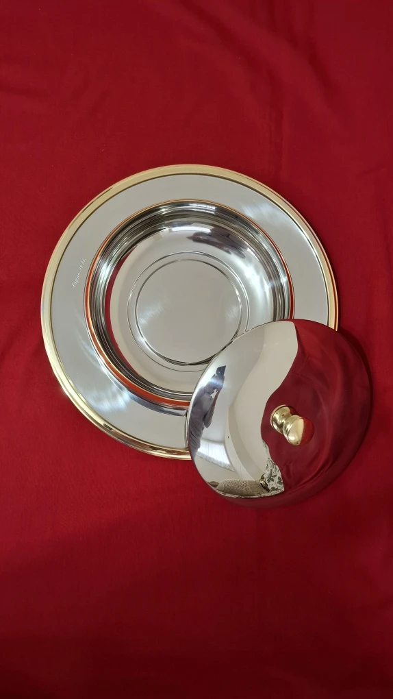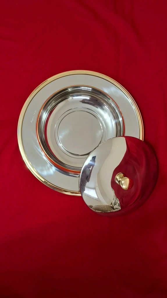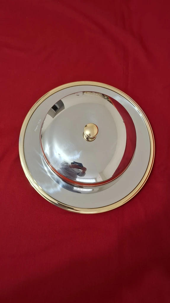 An Inoxpran stainless steel serving dish with bowl, charger and lid with 24kt gold detailing. See photos for measurements.