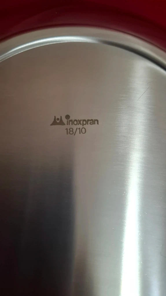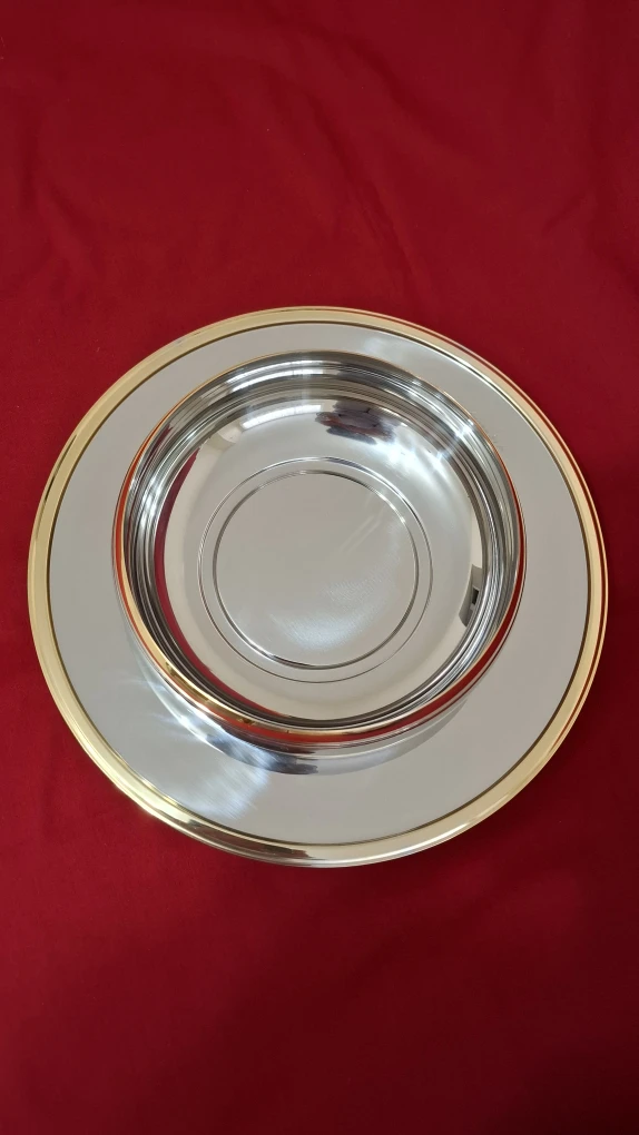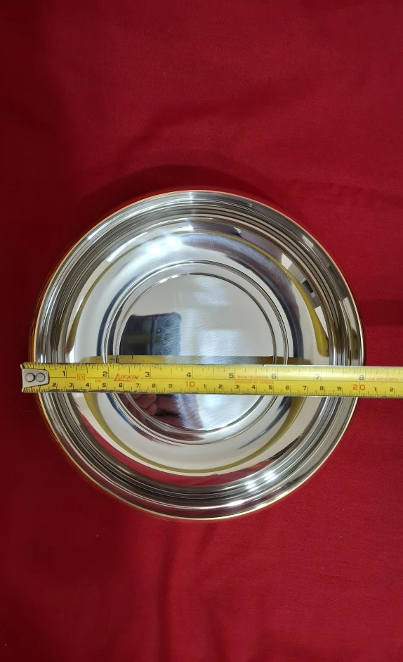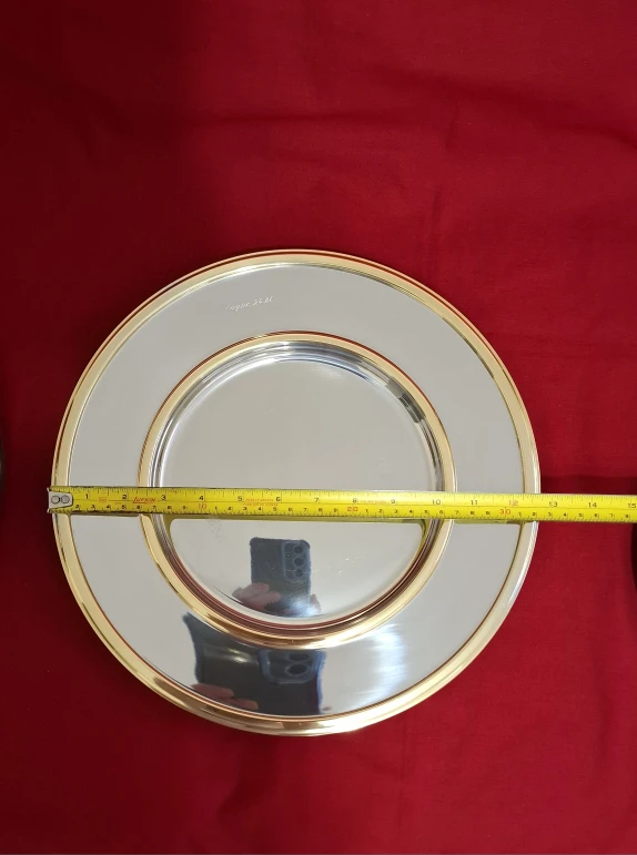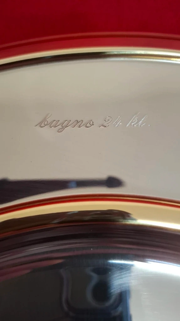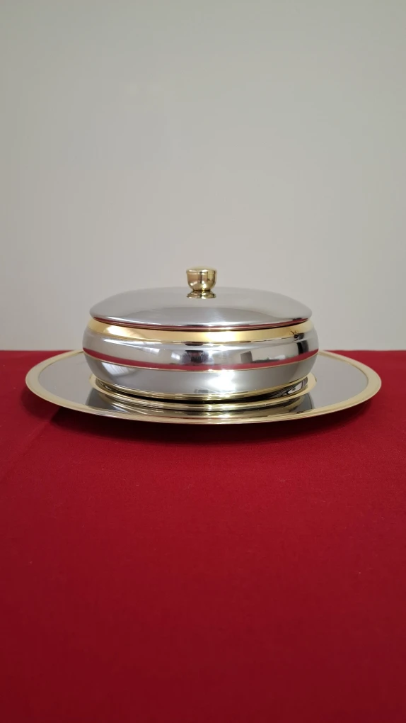 An Inoxpran stainless steel serving dish with bowl, charger and lid with 24kt gold detailing. See photos for measurements.