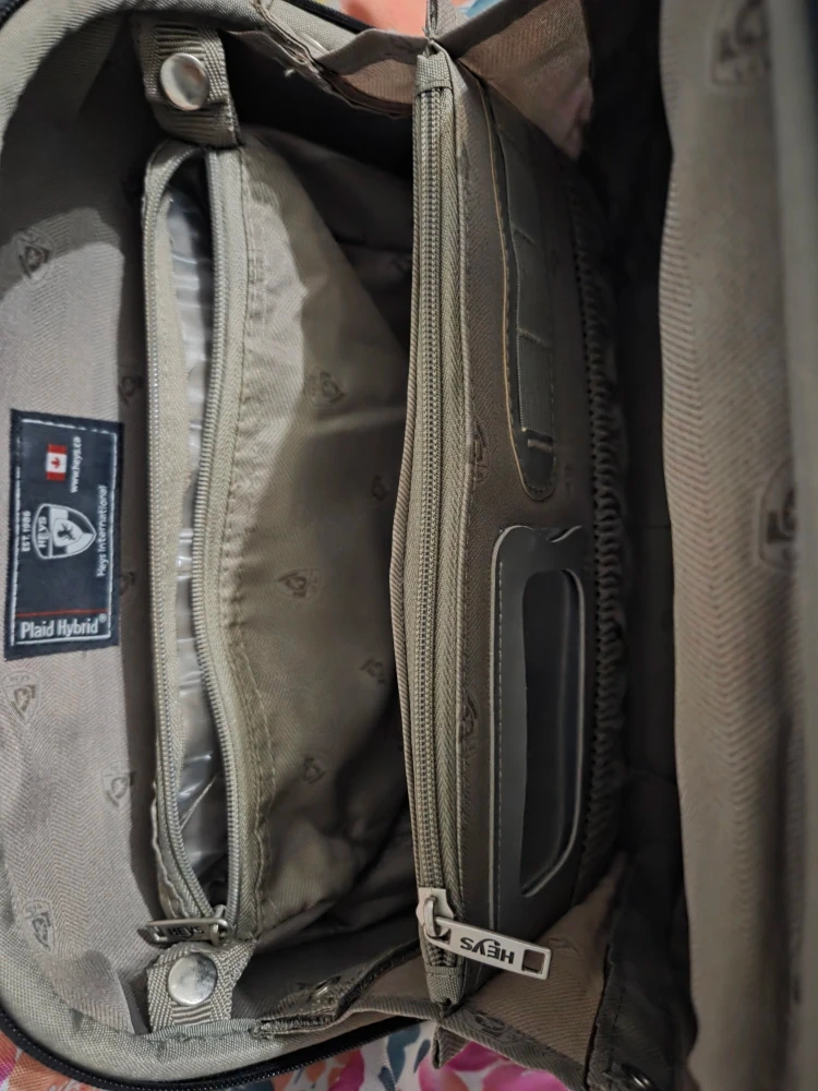 This is a HEYS Plaid Hybrid travel bag. It features a stylish plaid pattern and is perfect for carrying your essentials while travelling. The bag includes various compartments and zippers for organization.