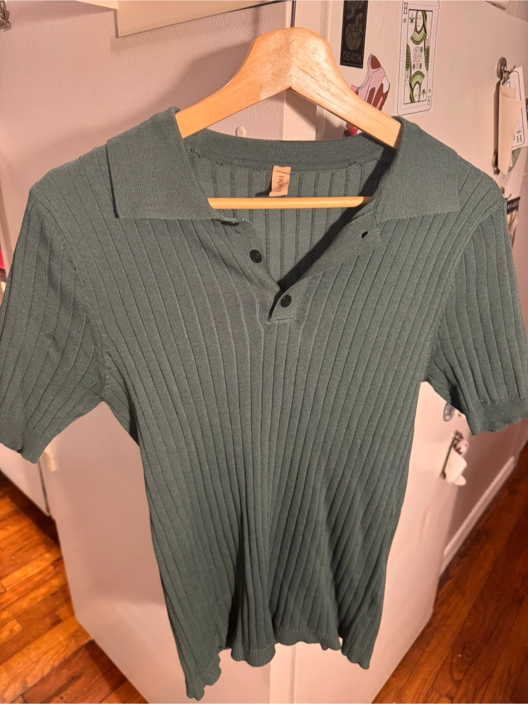 Here's a nice green ribbed polo shirt from Fabletics. It's in great condition and ready for a new home! The material is soft and comfortable, perfect for casual wear.