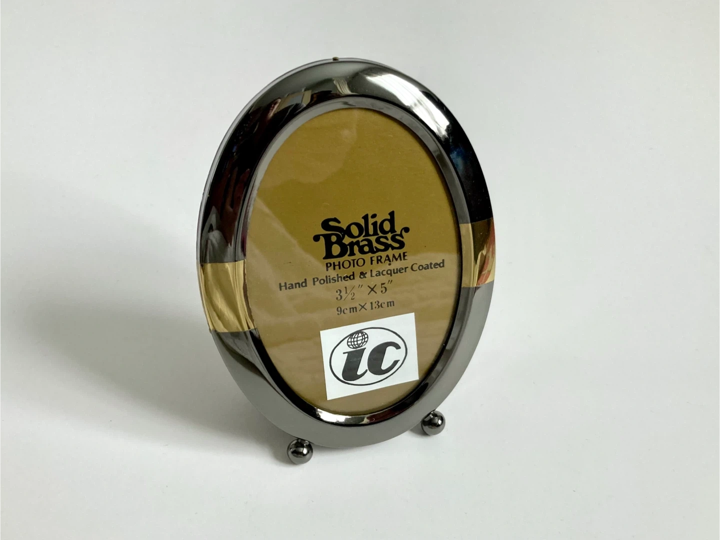 Vintage oval lacquered brass frame in a very unique, two toned stripe design. Features a silver gunmetal tone on the top and bottom with a brass stripe through the centre.