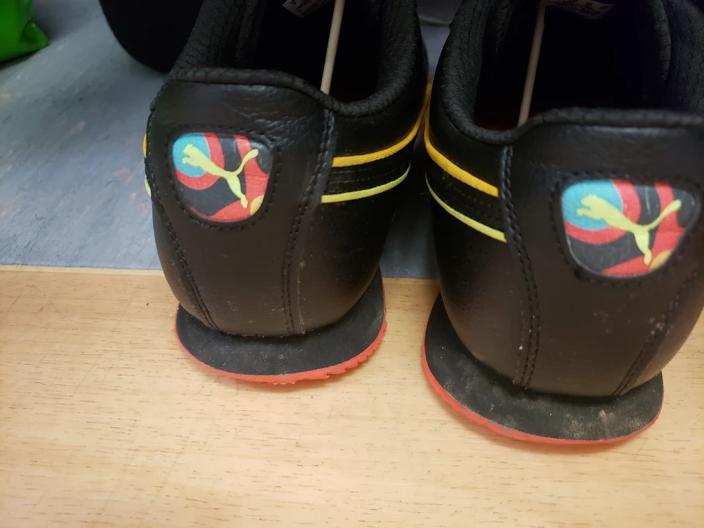 Selling a pair of Puma Roma sneakers in black! They feature a classic design with the Puma logo and stylish yellow and red accents. These shoes are perfect for casual wear and are in great condition. They are super comfy and ready for a new home!