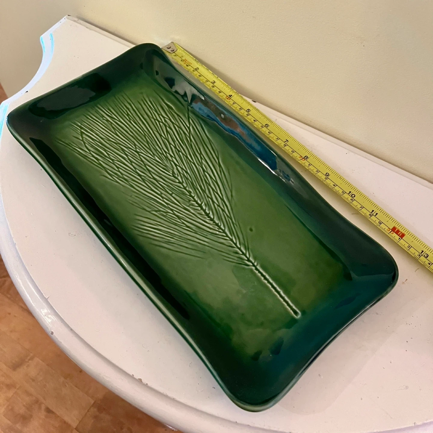 Signed Kay Wayne studio art pottery tray featuring a unique pine needle branch design in green. It's a beautiful piece, perfect for serving or as a decorative item.
