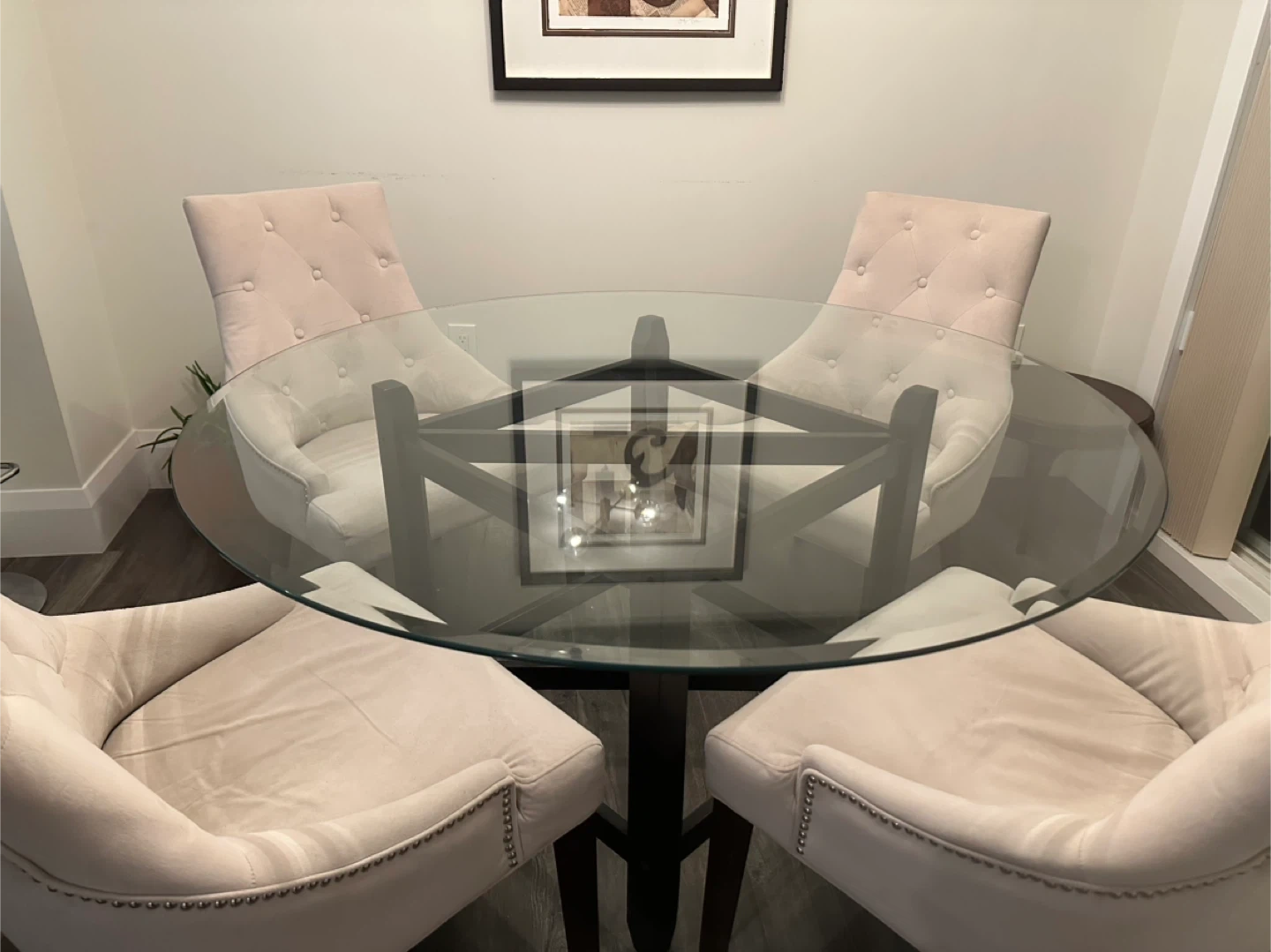 Selling a lovely round glass dining table, perfect for a smaller space or a cozy dining area! It comes with four matching chairs that are upholstered in a soft, light pink fabric. The table has a dark base that complements the chairs nicely. It's in great condition and ready for a new home!