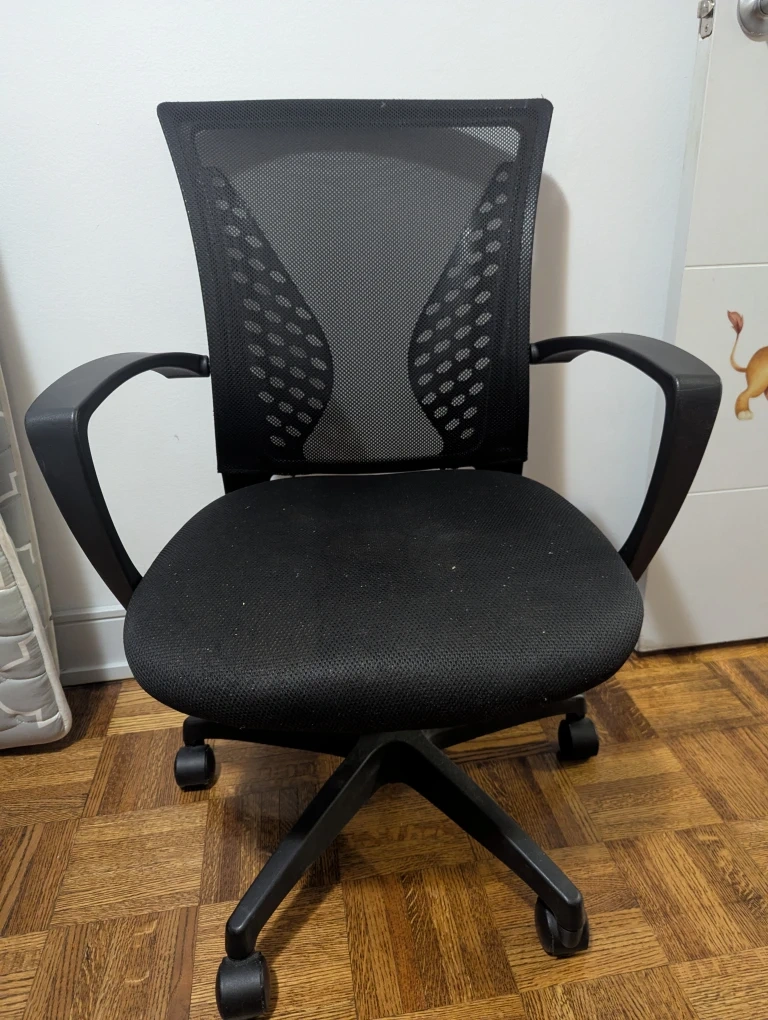 Selling a comfortable black mesh office chair! It's in great shape and perfect for your home office or study space. The mesh back provides good support and breathability, making it ideal for long hours of work or gaming