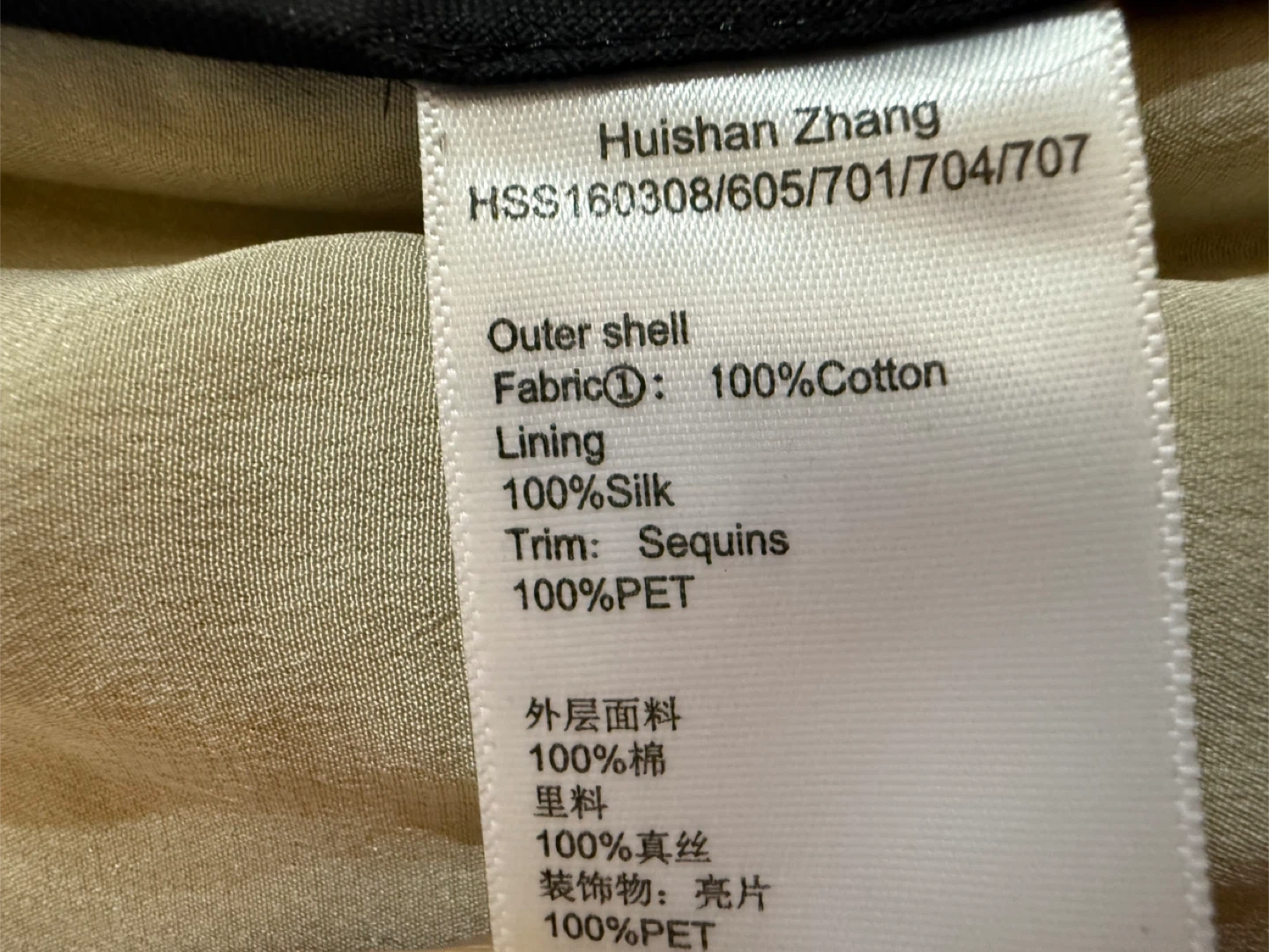 These Huishan Zhang shorts are so unique! They feature a black outer shell with sequin embellishments. The outer shell is 100% cotton, the lining is 100% silk, and the trim is 100% PET