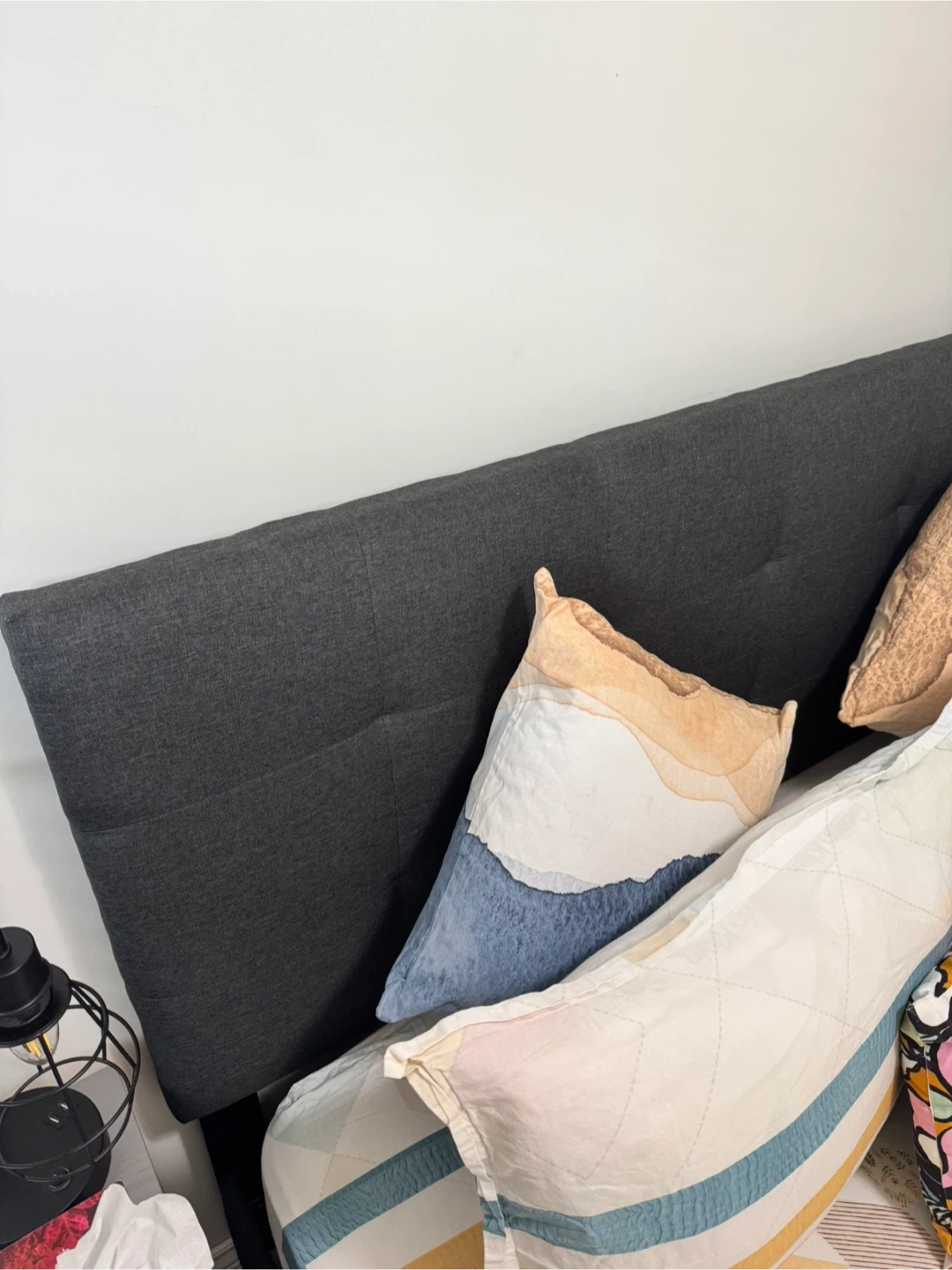 Selling a dark grey upholstered bed frame. It's in great condition and would look great in any bedroom! If you're interested, feel free to message me
