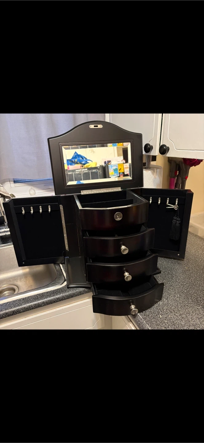 Selling a dark brown wooden jewelry box with multiple drawers and a mirror. It's in great condition and perfect for storing your jewelry and accessories