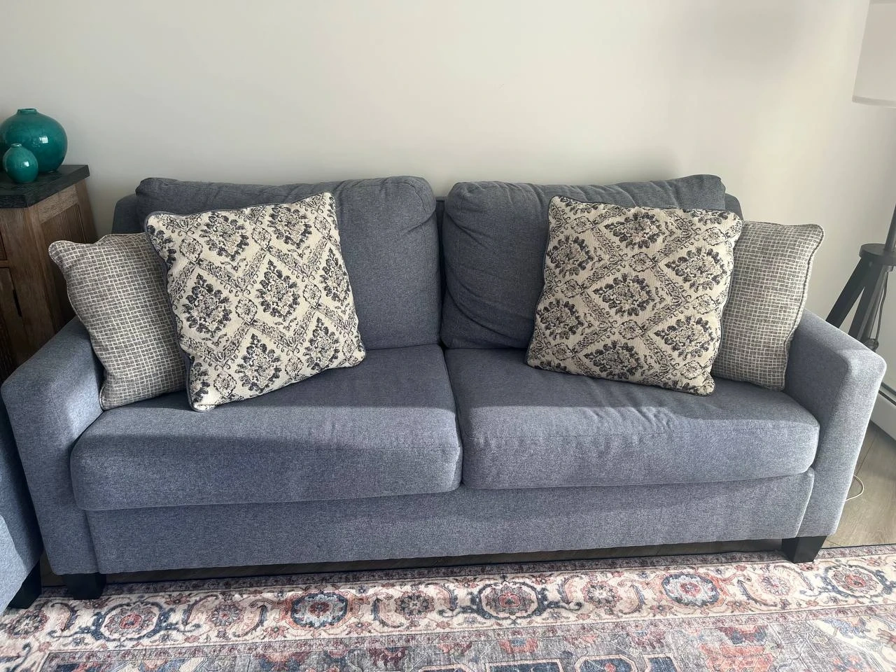 Selling a comfy blue loveseat sofa! It's in great shape and would be perfect for a small space or apartment. The cushions are soft and the fabric is durable. It comes with the decorative pillows shown in the picture!