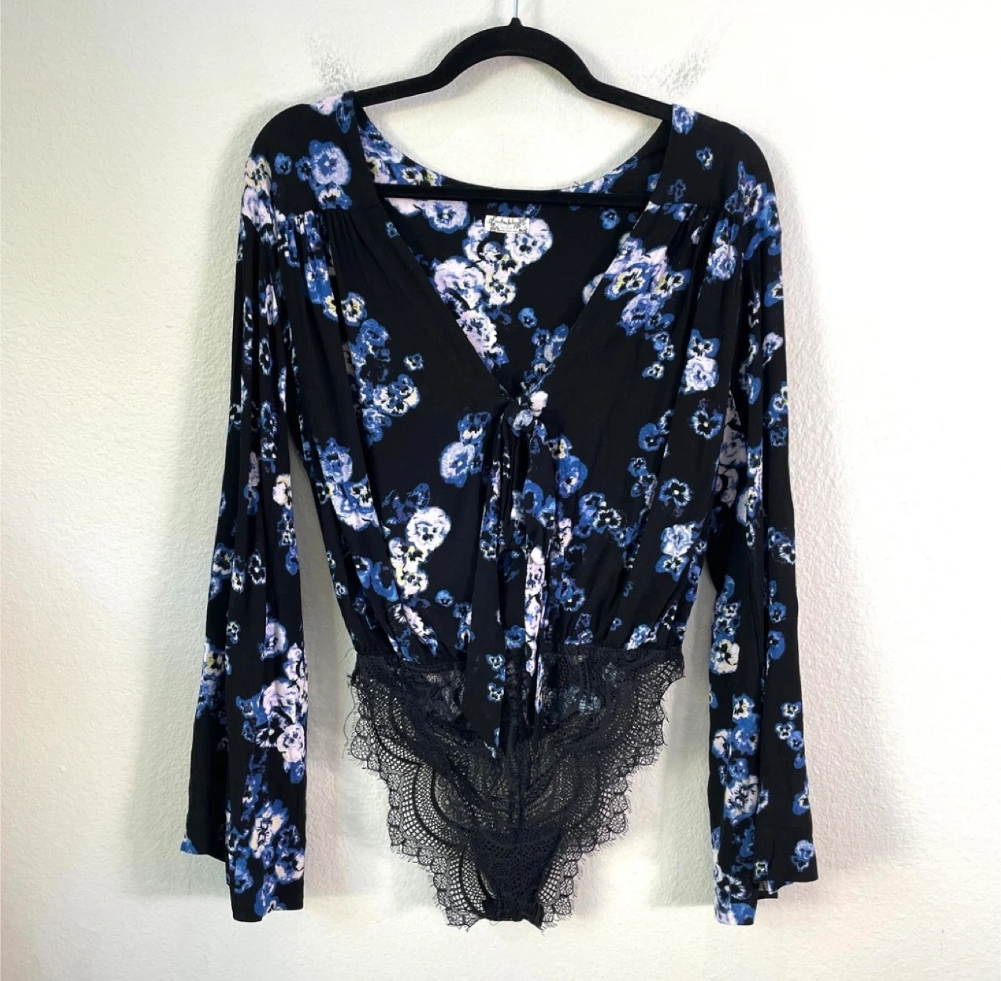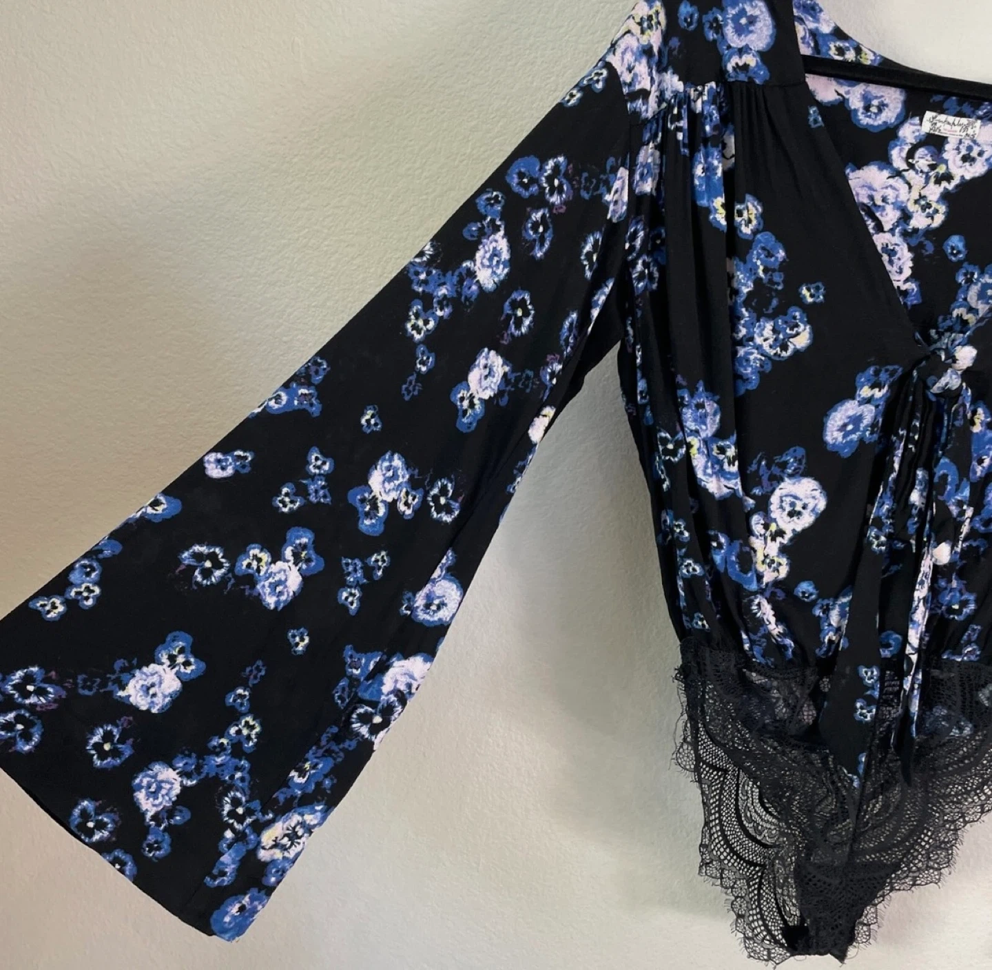 Soft fabric with a beautiful pansy floral print, tie front, bell sleeves and a delicate lace bottom with snap closure. No detail was spared in this design and it is an absolutely stunning piece. Multiple stock images show the fit and ways it can be worn.