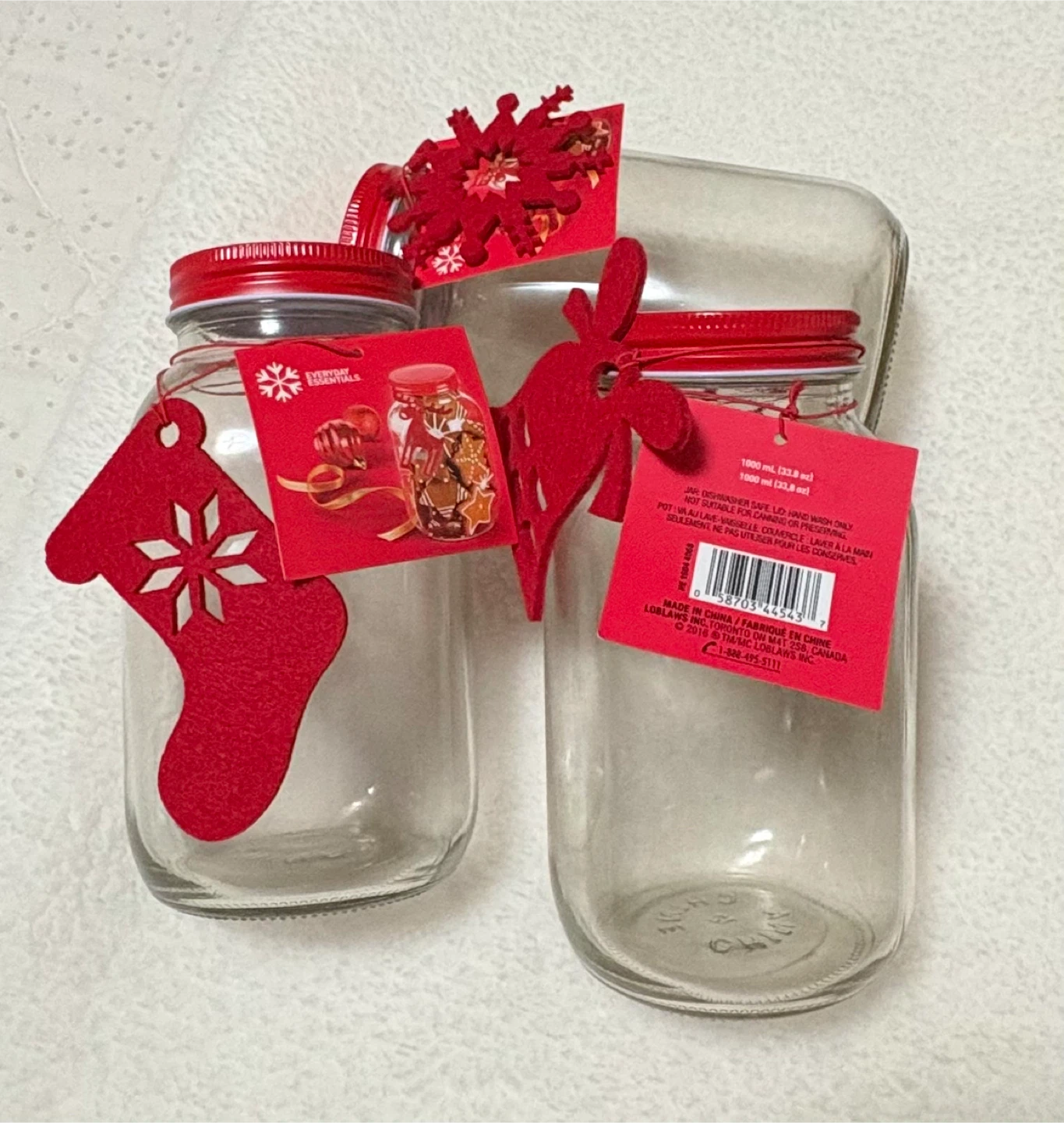 Add a touch of festive charm to your kitchen or gift-giving with these Everyday Essentials jars. These jars are new and have a 1000 ml (33.8 oz) capacity, complete with delightful red accents and holiday-themed decorations. These jars are perfect for storing your favourite treats or creating a thoughtful, homemade gift!
