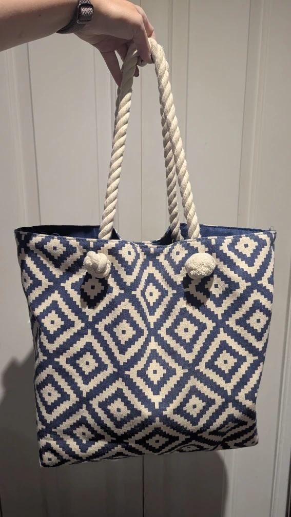 Here's a stylish tote bag featuring a geometric pattern! It's perfect for carrying your essentials around town or to the beach. The rope handles add a nice touch of nautical flair. Great for everyday use!