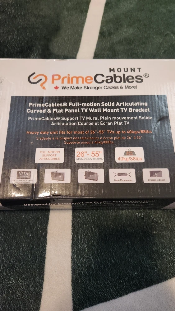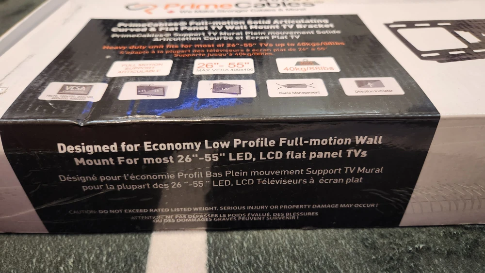 Selling a new PrimeCables full-motion solid articulating curved and flat panel TV wall mount bracket. It's designed for most 26"-55" LED, LCD flat panel TVs and can support TVs up to 40kg/88lbs. This heavy-duty unit is perfect for securely mounting your TV!