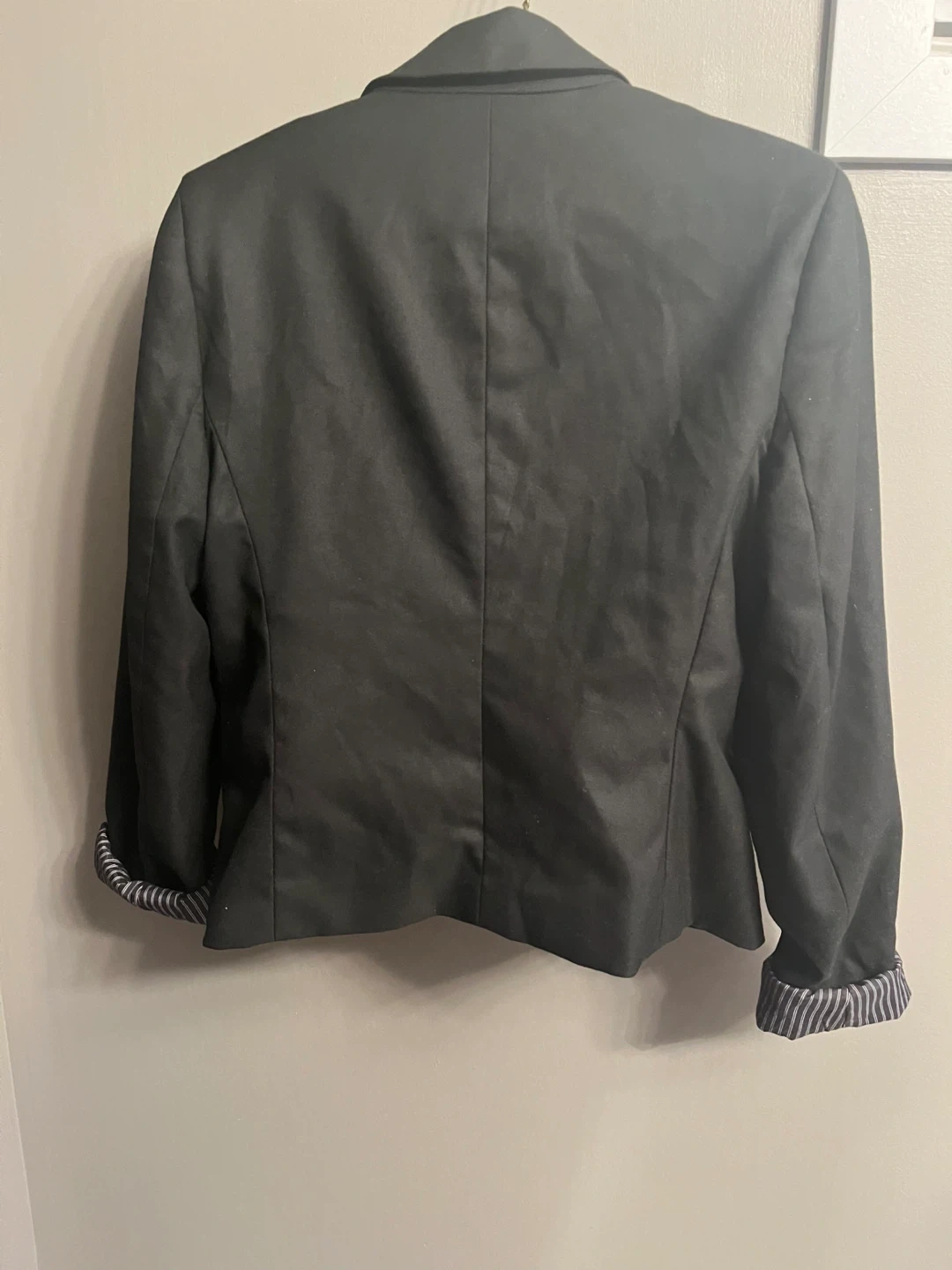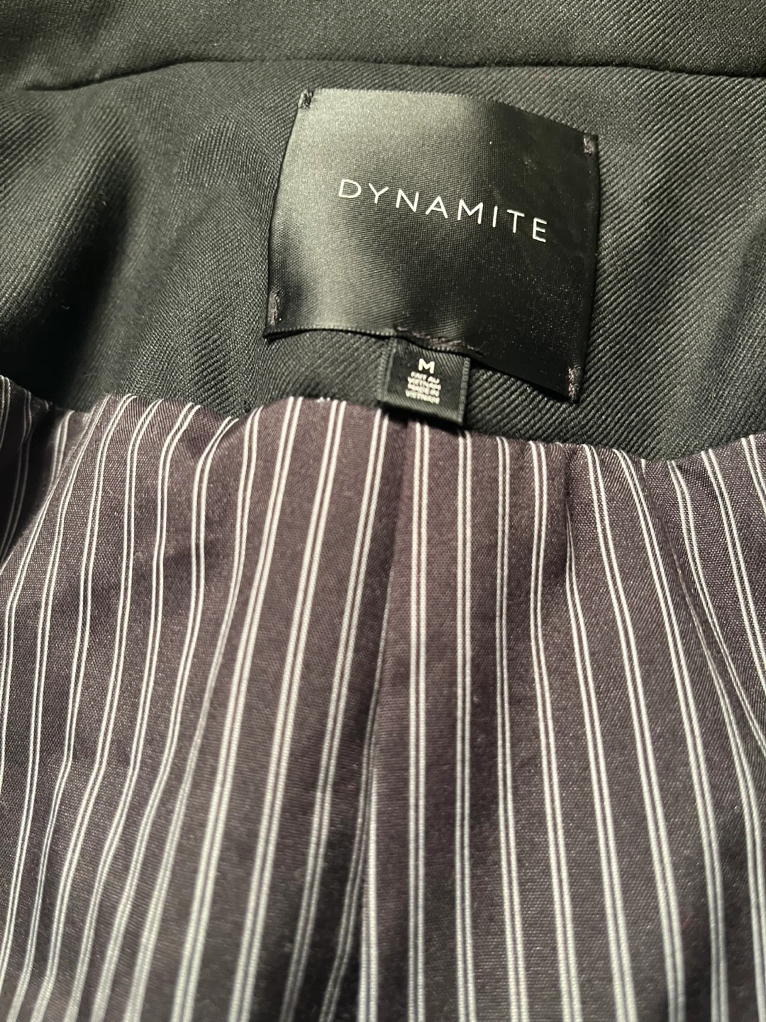 Selling a Dynamite black blazer in size medium! It's in great condition and would be a lovely addition to your wardrobe. The blazer features a sleek design with a single button closure and stylish striped lining on the cuffs.