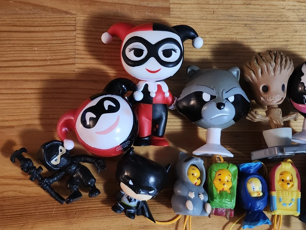 A collection of assorted figurines featuring characters from DC Comics (Harley Quinn, Batman), Marvel (Groot, Rocket Raccoon, Venom), and Looney Tunes (Tweety Bird) etc...