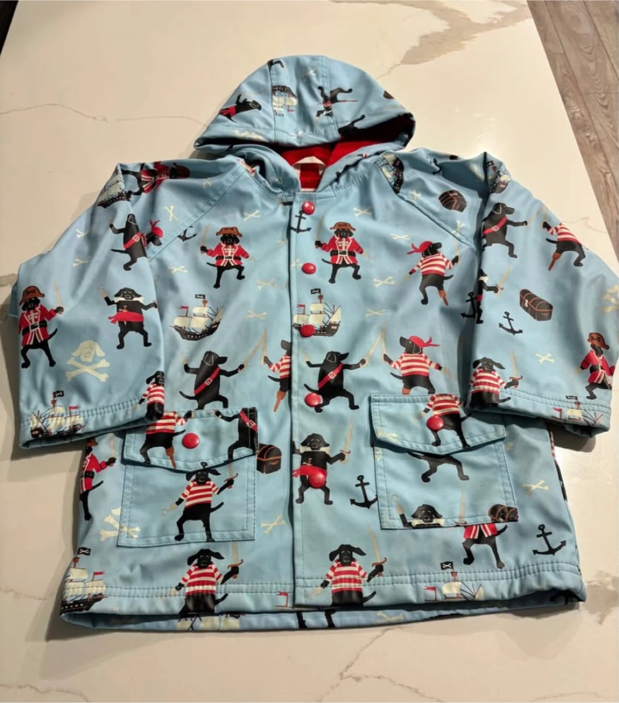 This adorable Hatley raincoat is perfect for keeping your little one dry on rainy days! It features a fun pirate pups print on a light blue background with a red lining. It's a size 5 and in great condition, ready for a new home.