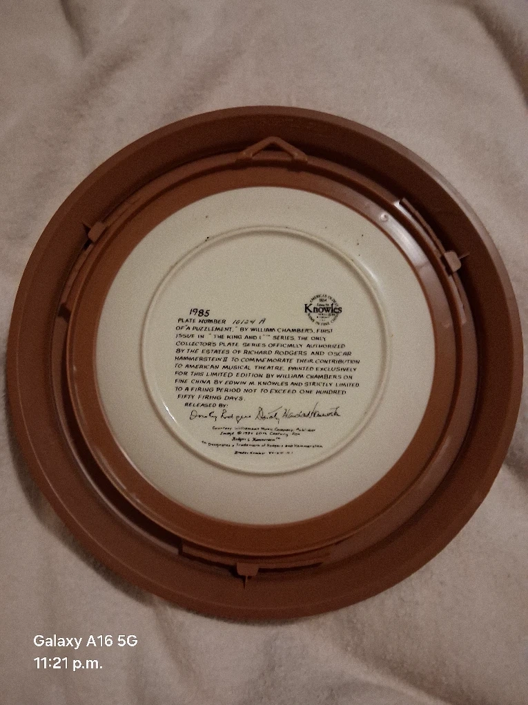 Selling a 1985 Knowles collector plate featuring a scene from "The King and I". This plate is part of a puzzle element series officially authorized by the estates of Rodgers and Hammerstein II. It commemorates their contribution to American musical theatre. The plate number is 16124 A. It was released by Daniel Hurlbutt.