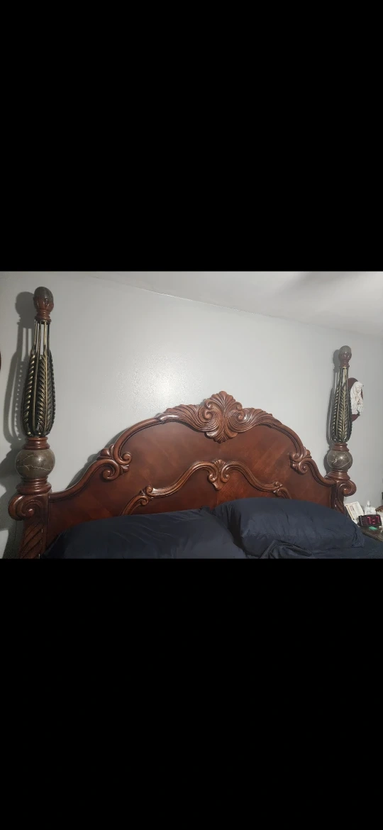 Selling a beautiful, ornate wood bed frame! It's in great shape and would add a touch of elegance to any bedroom. The dark wood finish and detailed carvings are really eye-catching