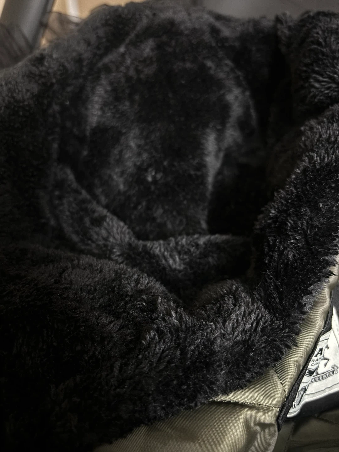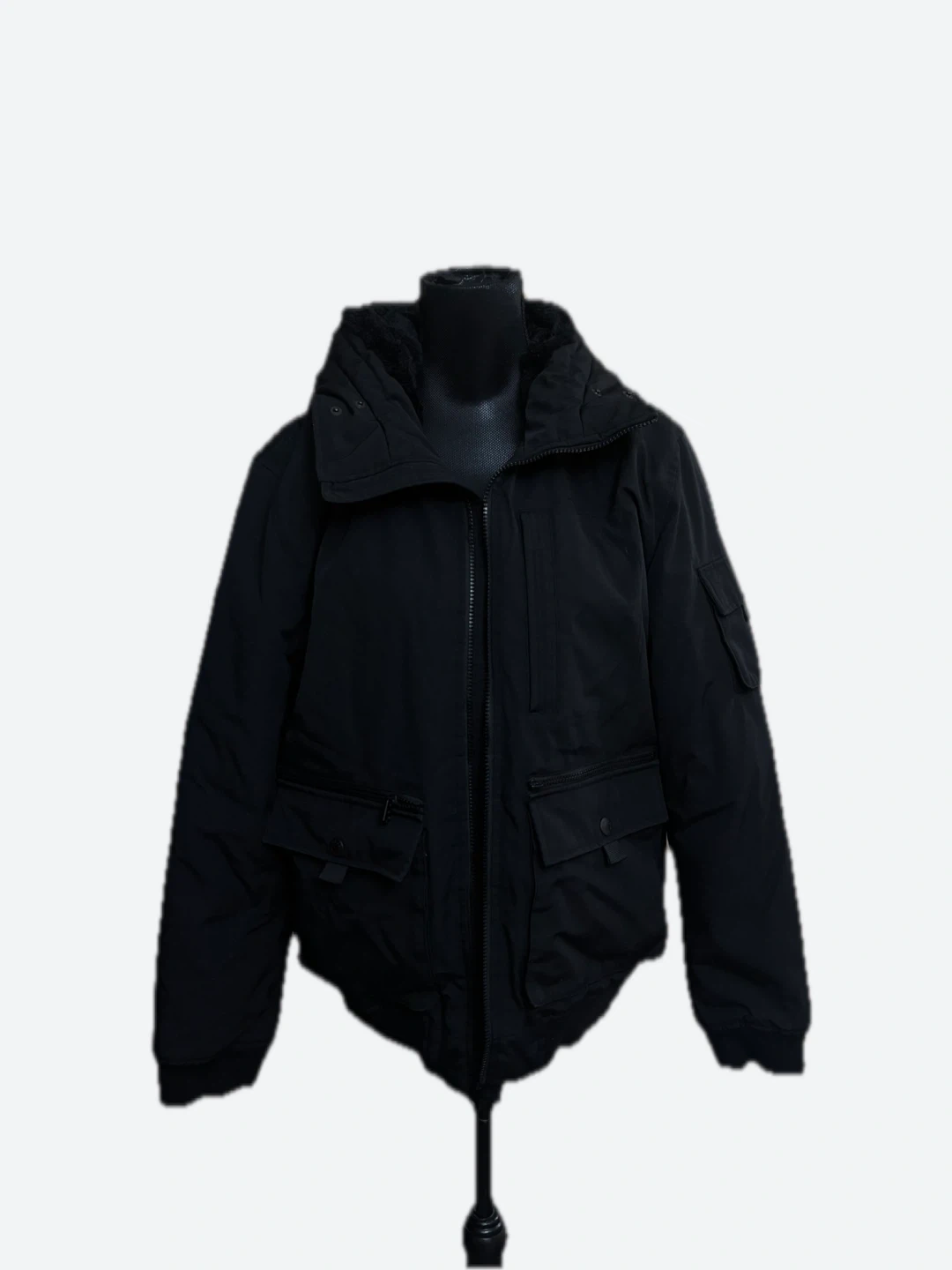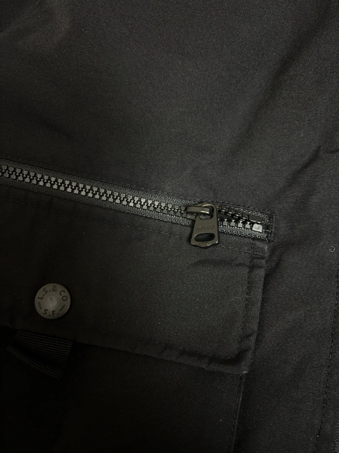This is a stylish black puffer jacket from Levis. It features a cozy, fur-like lining and multiple pockets. Perfect for staying warm during the colder months!