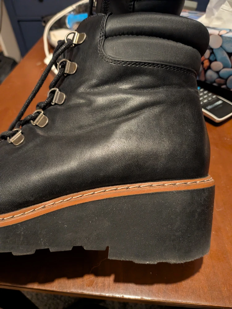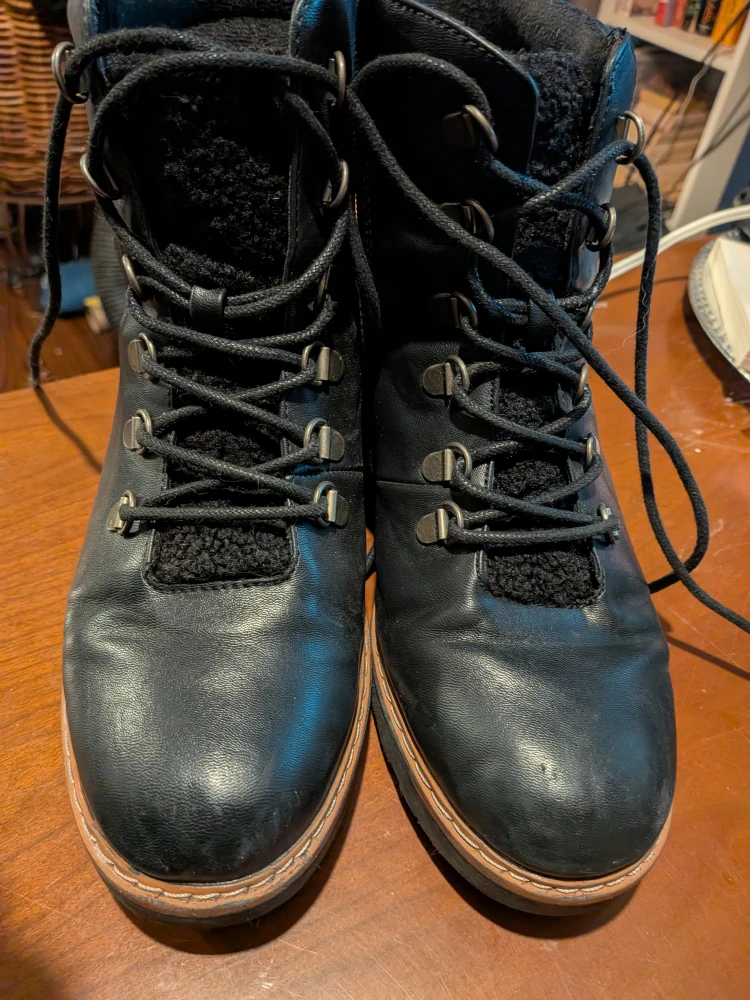 These are a pair of black BARETRACKS winter boots. They are well made and have soft inner lining. They are in used condition with some slight signs of wear, some tiny scratches, not really noticeable They have a lace-up design and a platform sole. They are perfect for keeping your feet warm and stylish during the winter months