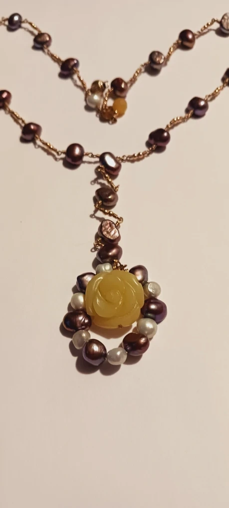Beautiful necklace featuring genuine freshwater pearls and a carved rose pendant. The necklace has a unique and elegant look, perfect for adding a touch of sophistication to any outfit !! 16" long. Excellent condition. ALL MY PRICES ARE NEGOTIABLE !!