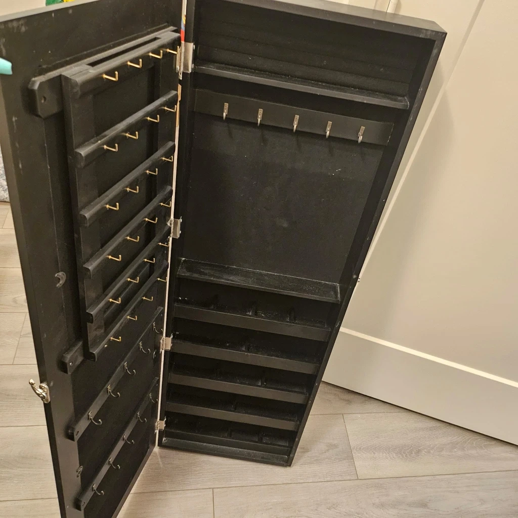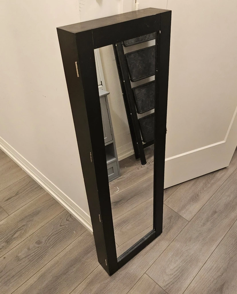 Selling a wall-mounted jewelry organizer with a mirror. It's in excellent condition and ready to help keep your jewellery neat and tidy. The dimensions are approximately 44" x 14.5" x 4"