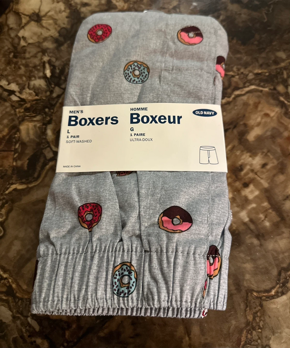Selling a brand new pair of Old Navy men's boxers, size large. They feature a fun donut print and are soft-washed for extra comfort. Never been worn and still in the original packaging!