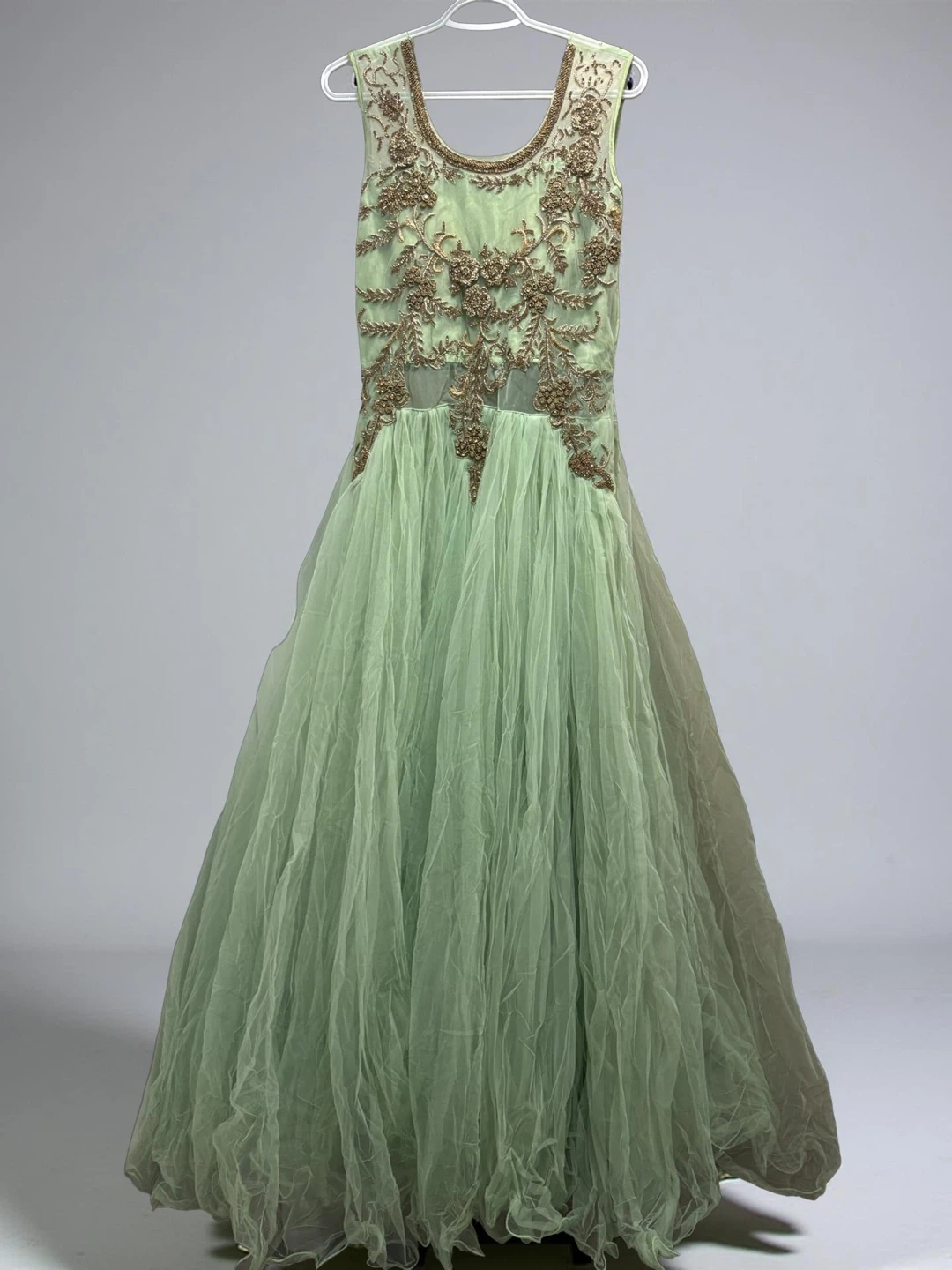 Beautiful mint green formal gown with detailed gold embroidery and a soft, flowy tulle skirt.