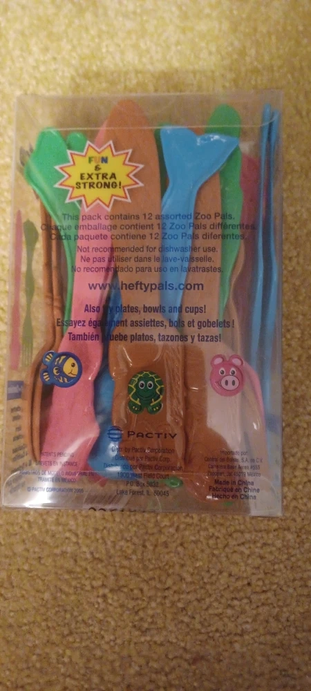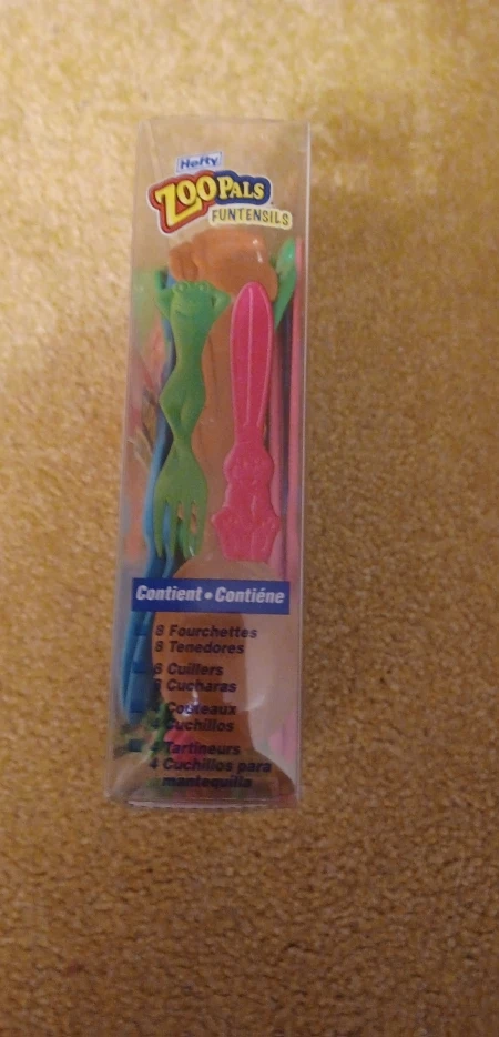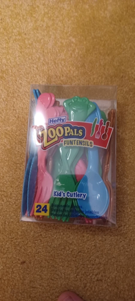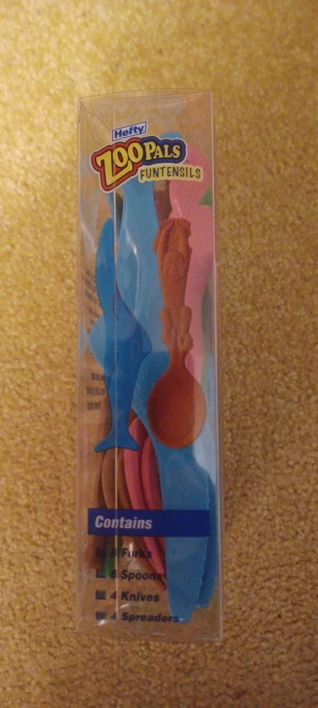 This is a new package of Hefty Zoo Pals Fun Utensils for kids. These disposable kid's cutlery sets make mealtime fun with assorted zoo animals. Each package contains 24 pieces with assorted forks, spoons, knives, and spreaders. They are extra strong and great for picnics and parties.