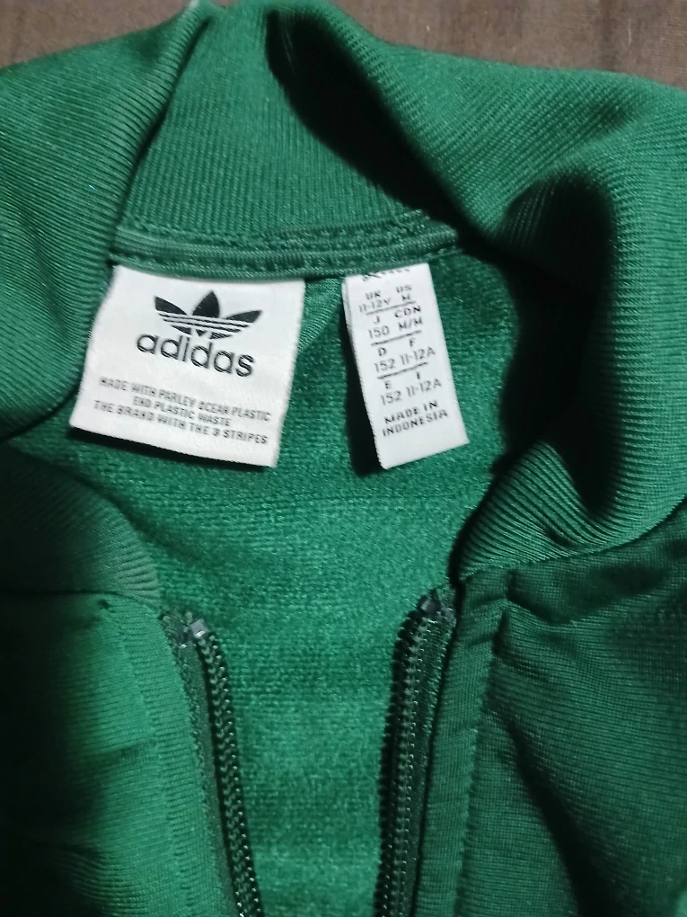 Selling a green Adidas track jacket in size 11 years old. It features the iconic three stripes and the Adidas logo. Perfect for sporty looks or casual wear!