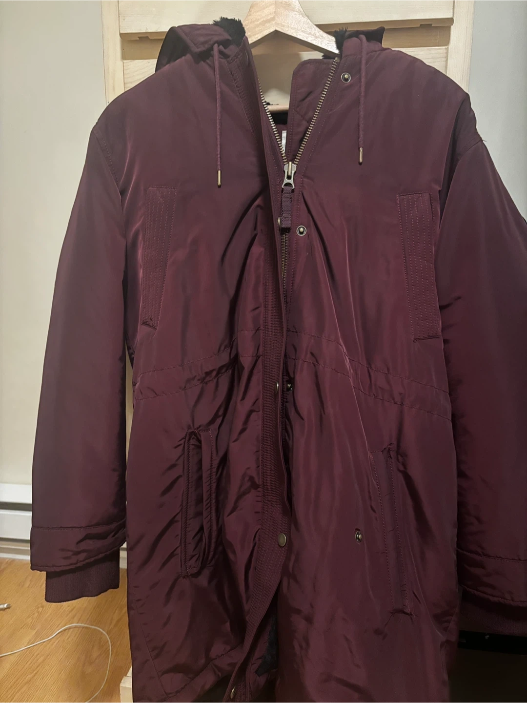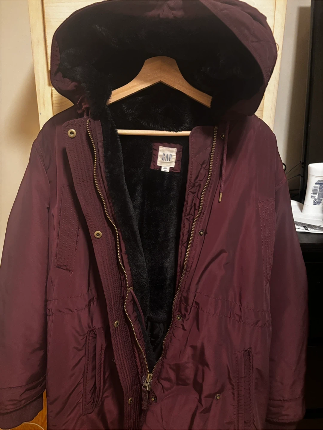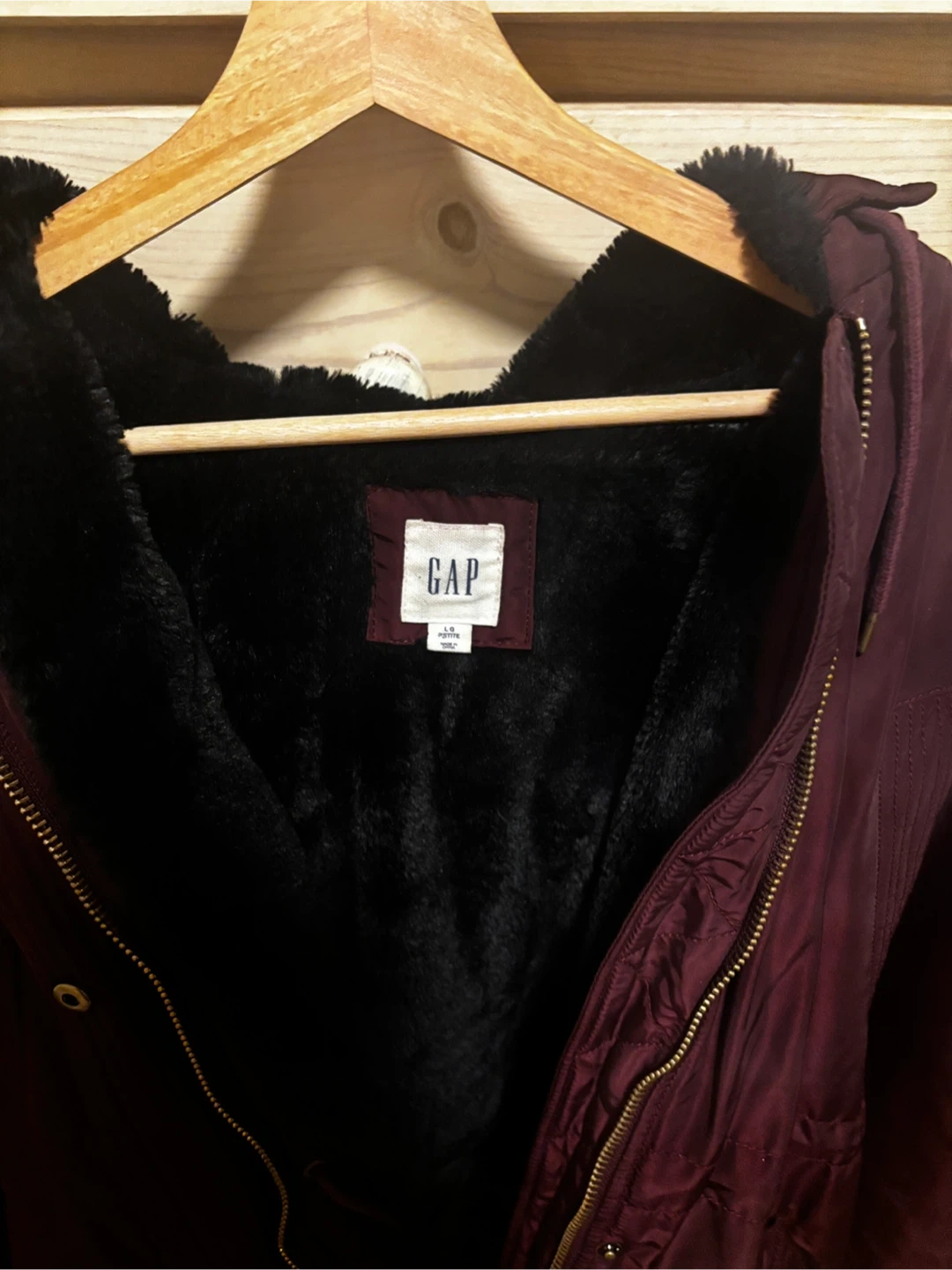Selling a GAP burgundy winter parka in size large. It has a cozy black faux fur lining to keep you warm during the colder months. It's in great condition, barely used.