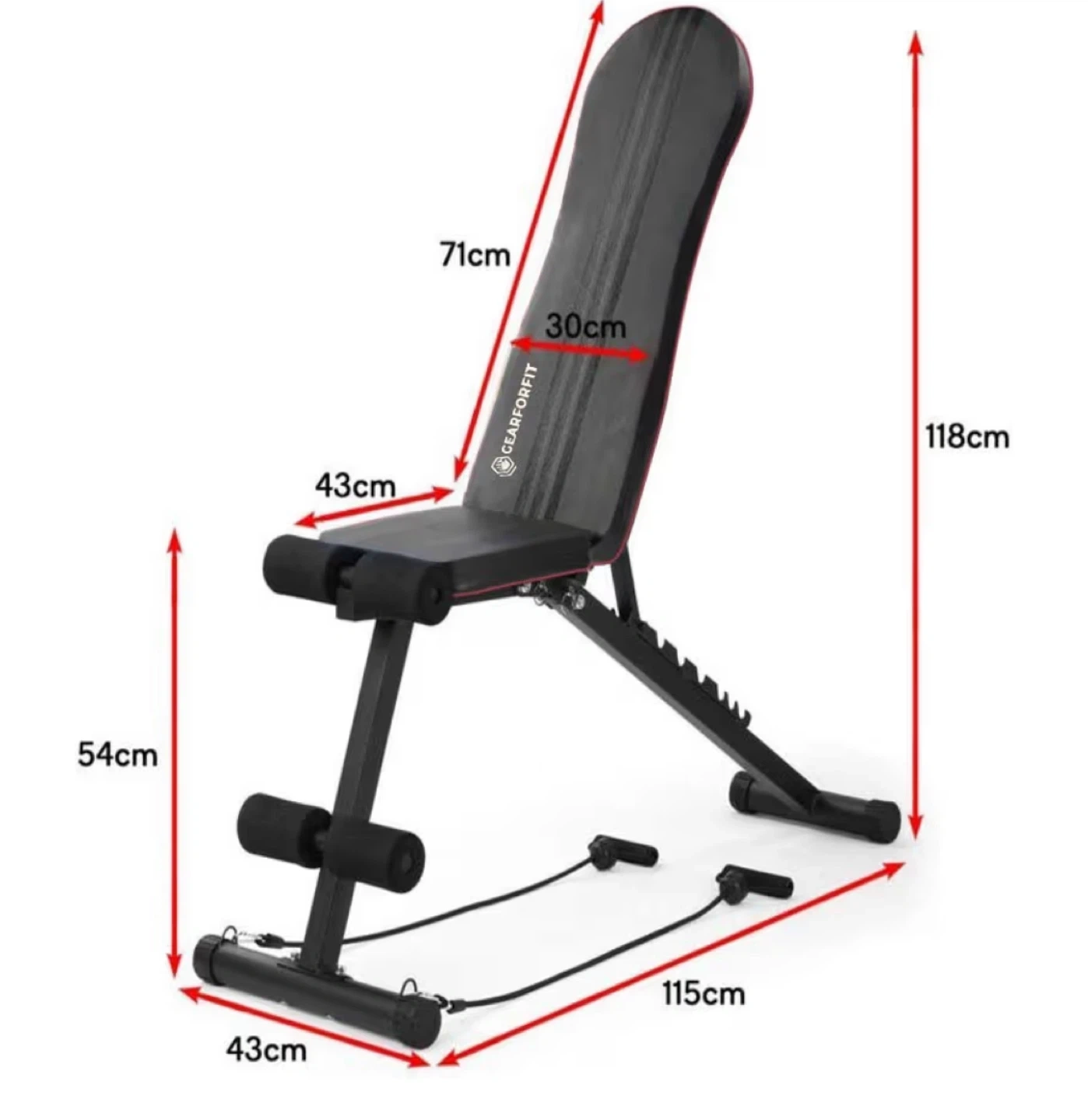 Selling a Gearforfit adjustable weight bench. It's in great condition and ready for your home gym! The bench is black with red accents and has the following dimensions: 71cm (height of the backrest), 30cm (width of the backrest), 43cm (seat depth), 118cm (total height), 54cm (height to the seat), and 115cm (length of the base).