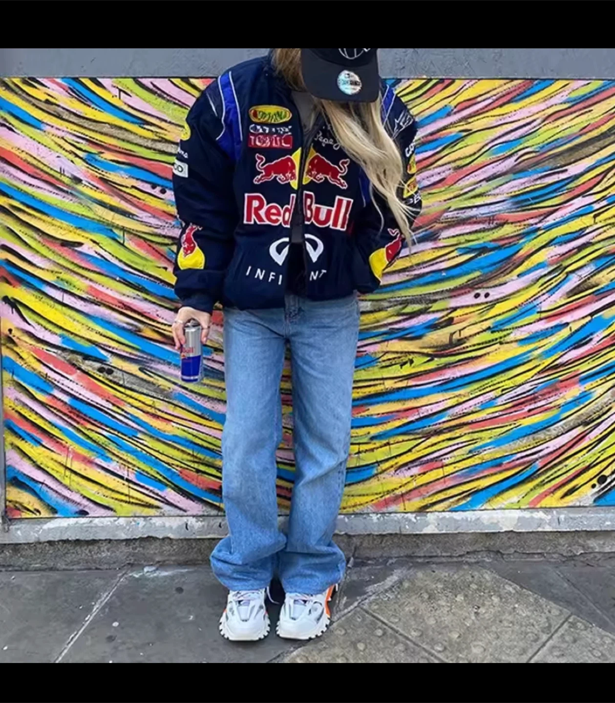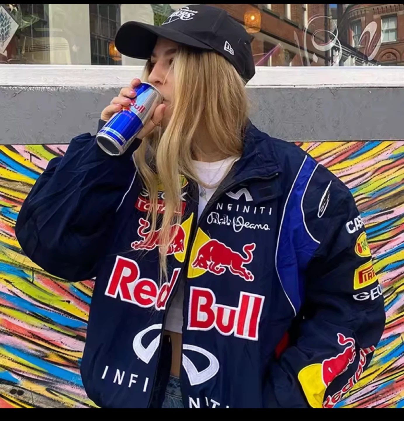 Selling a Red Bull Racing jacket. It has logos from various sponsors, including Rauch, Geox, Total, Infiniti, and Pepe Jeans. The jacket is navy blue with white and red accents. It's in great condition and ready for a new owner!