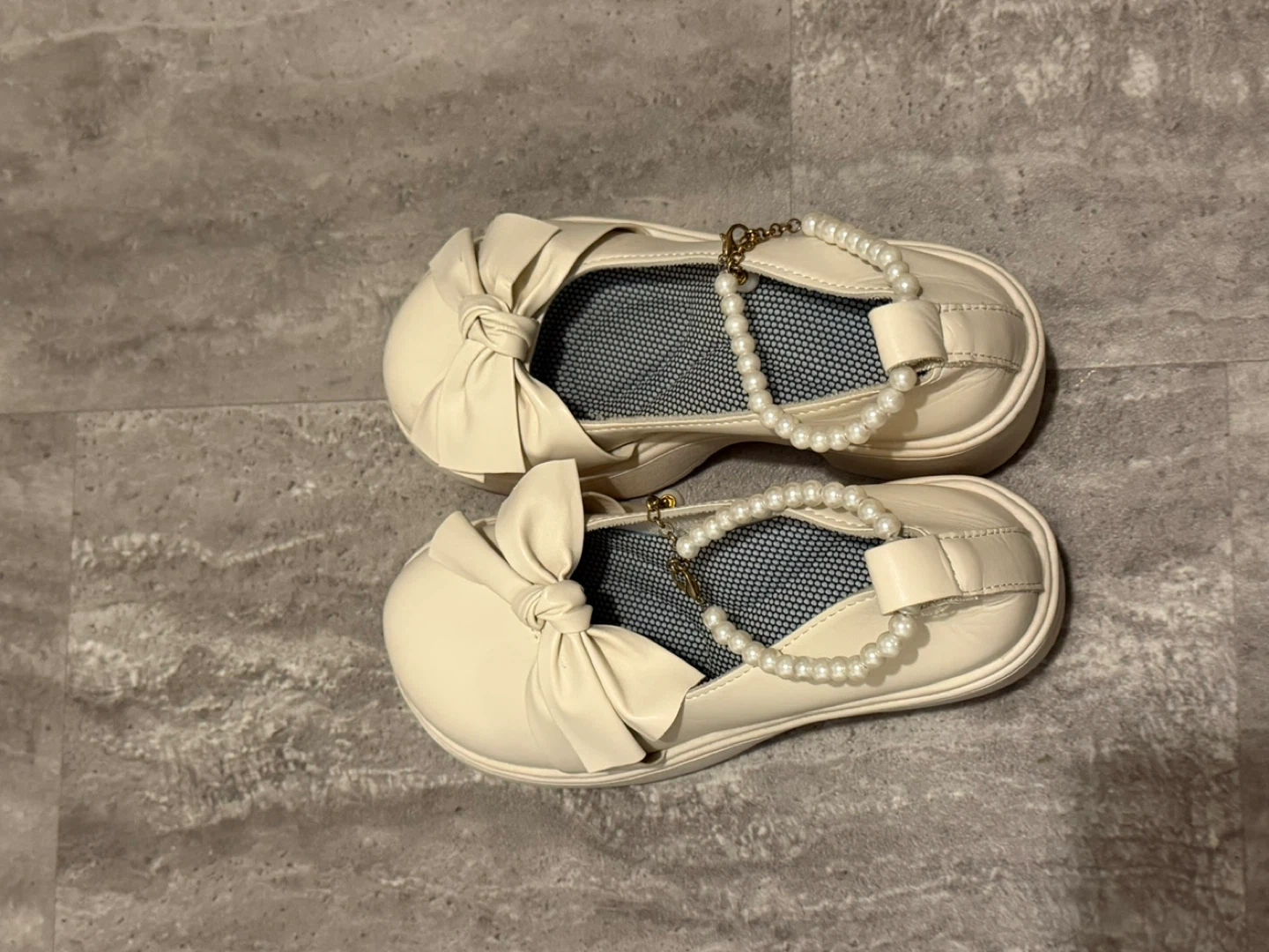 These cream-coloured platform heels are super cute! They feature a sweet bow detail and a string of pearls for a touch of elegance. Perfect for adding a bit of height and style to any outfit