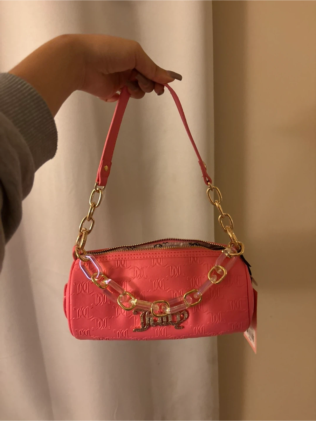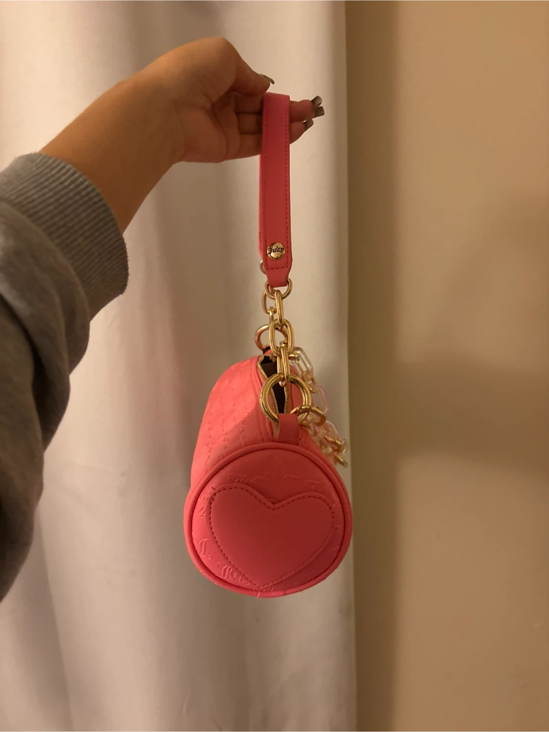 Check out this cute pink barrel bag from Juicy Couture! It's in great condition and perfect for adding a pop of colour to any outfit. It features a heart design and gold chain detailing, making it super stylish and fun