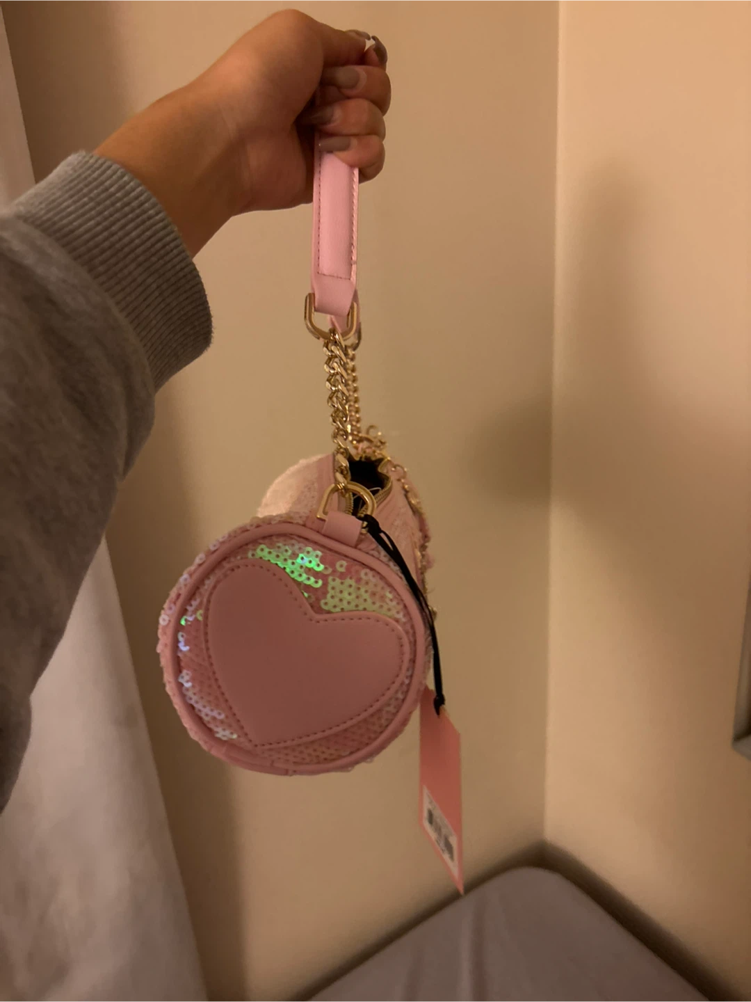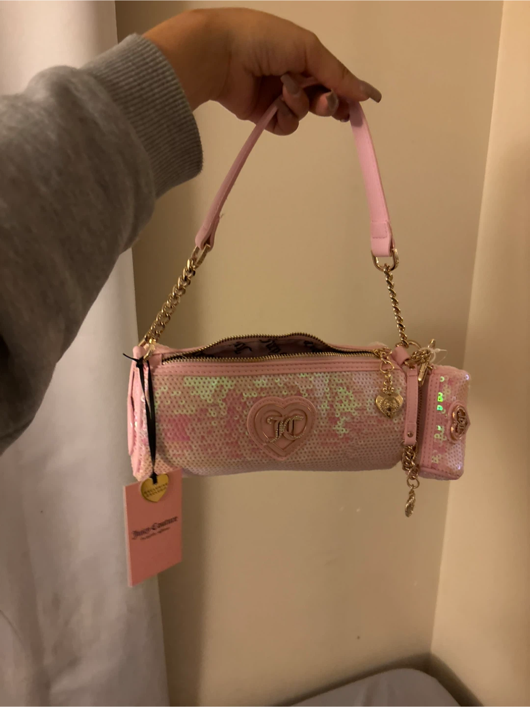 Check out this adorable Juicy Couture shoulder bag! It's pink and covered in sequins, and it comes with a small heart-shaped coin purse attached. Perfect for adding a bit of sparkle to your outfit