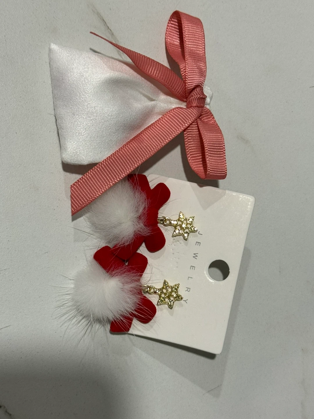 These are a pair of super cute earrings! They feature a red flower with a white fuzzy puff and a gold star. Perfect for adding a pop of fun to any outfit!